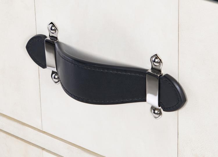 • Real Vellum chest with Black Leather details and custom Polished Nickel hardware and fittings.