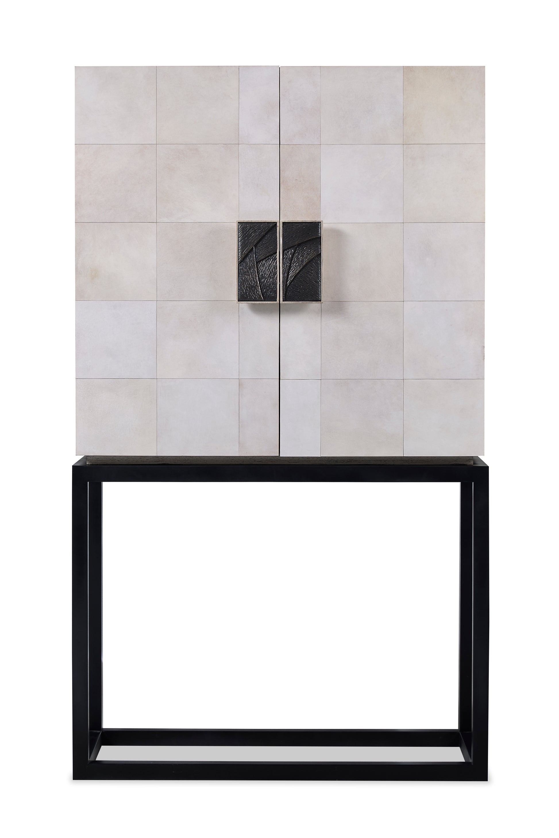 Real Vellum front bar cabinet with custom hardware. This bar cabinet features a mirrored interior with adjustable shelves, two pull-out drawers, a pull-out glass cutting board, and a puck light. Black metal base.