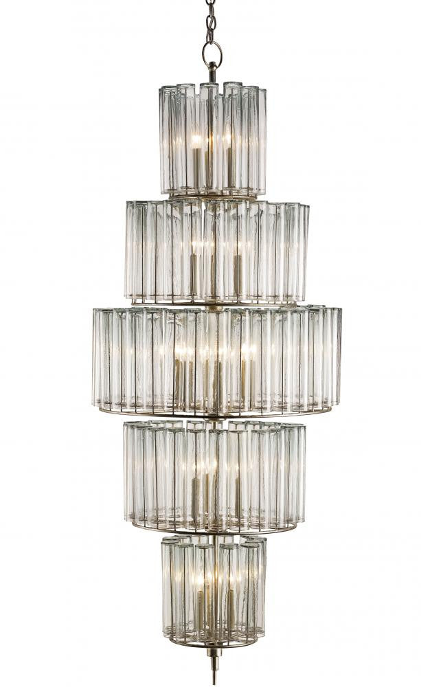The large version of our Bevilacqua Chandelier is a magnificent toast to good taste. Filled with luminosity and grace, its five tiers of reflective glass flutes are made from recycled bud vases. Its wrought iron frame is finished in an exquisite silver leaf that compliments the hues in the glass. This 18-light chandelier with its ascending and descending architecture is one in a variety of fixtures in the Bevilacqua collection.