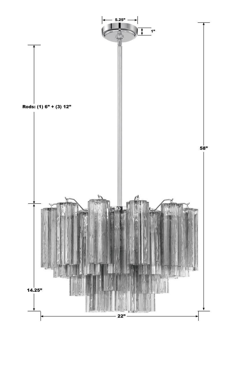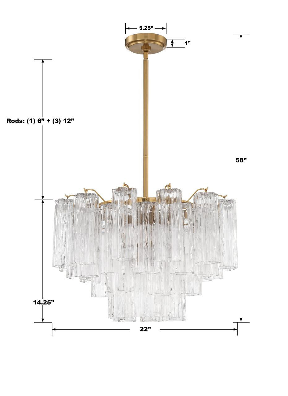 The captivating Addis Lighting Collection is a modern-day interpretation of the iconic mid-century Tronchi chandelier. Inspired by its predecessor's sleek lines and geometric shapes, the Addis features a polished Chrome or Aged Brass metal frame that exudes sophistication and style. Its unique design showcases transparent tiers of textured Tronchi glass tubes, forming a mesmerizing 5-point rounded star shape. Choose from a range of glass colors, including clear, amber, smoke, and white, or the stunning Autumn option, which features a captivating multicolor disposition of amber, clear, and smoke Tronchi glass. The Addis Lighting Collection offers various sizes and finishes, allowing you to find the perfect fit for your space while adding a touch of timeless elegance.