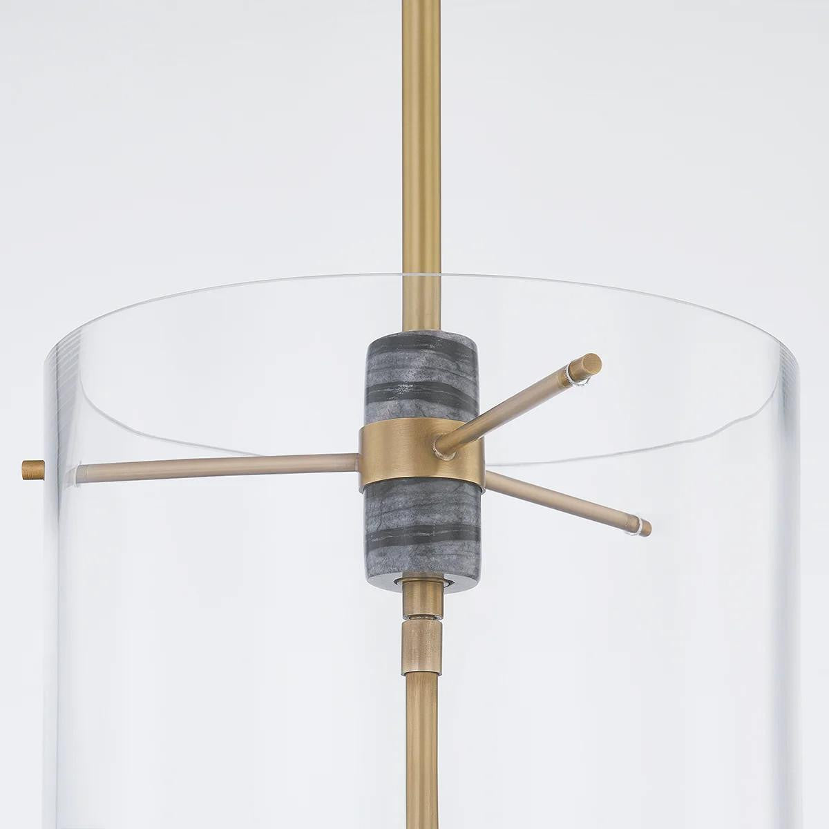 Adonis takes a familiar lantern silhouette and combines it with a unique and upscale mix of materials to make it stand out and feel special. A clear glass cylindrical shade houses a set of honed Nero Madera Marble candlesticks with Vintage Brass accents for a refreshing yet refined look that complements any interior. Style alone or in multiples.