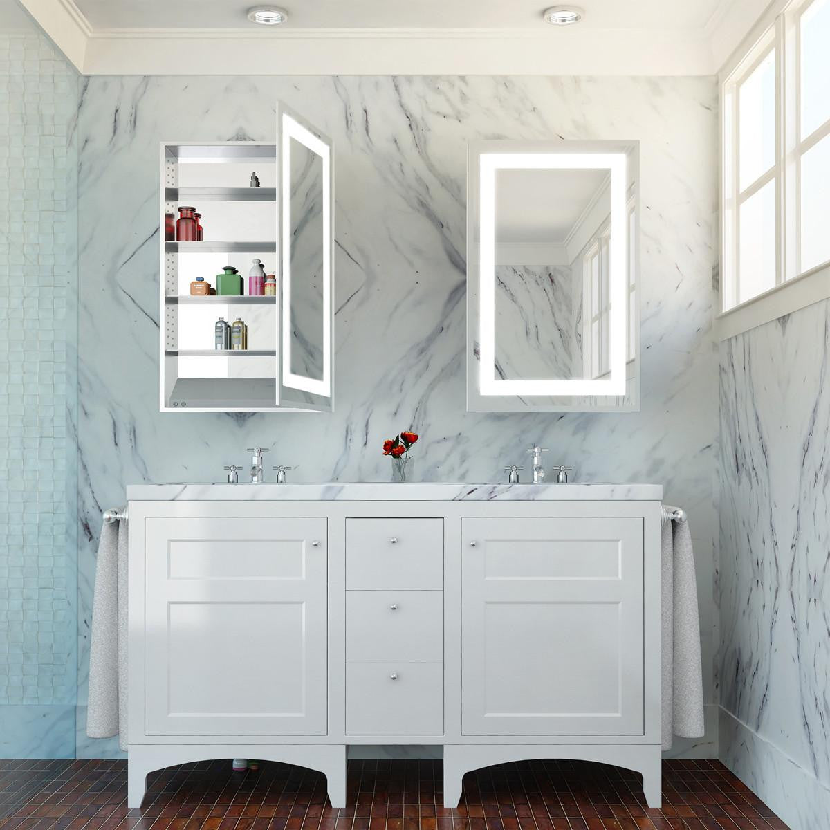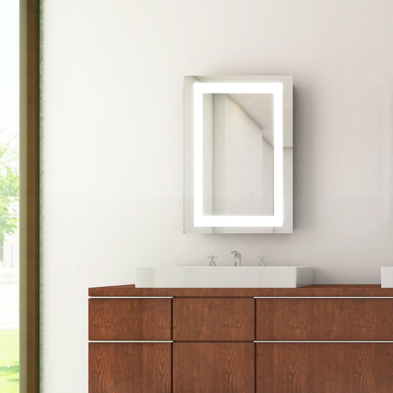 Add Ambiance to your bathroom space and create a uniquely modern look with real-world functionality. It features a frame of lustrous light and a precision polished edge €â€Â an ideal match for your contemporary decor. A wall switch is required for exterior light operation.