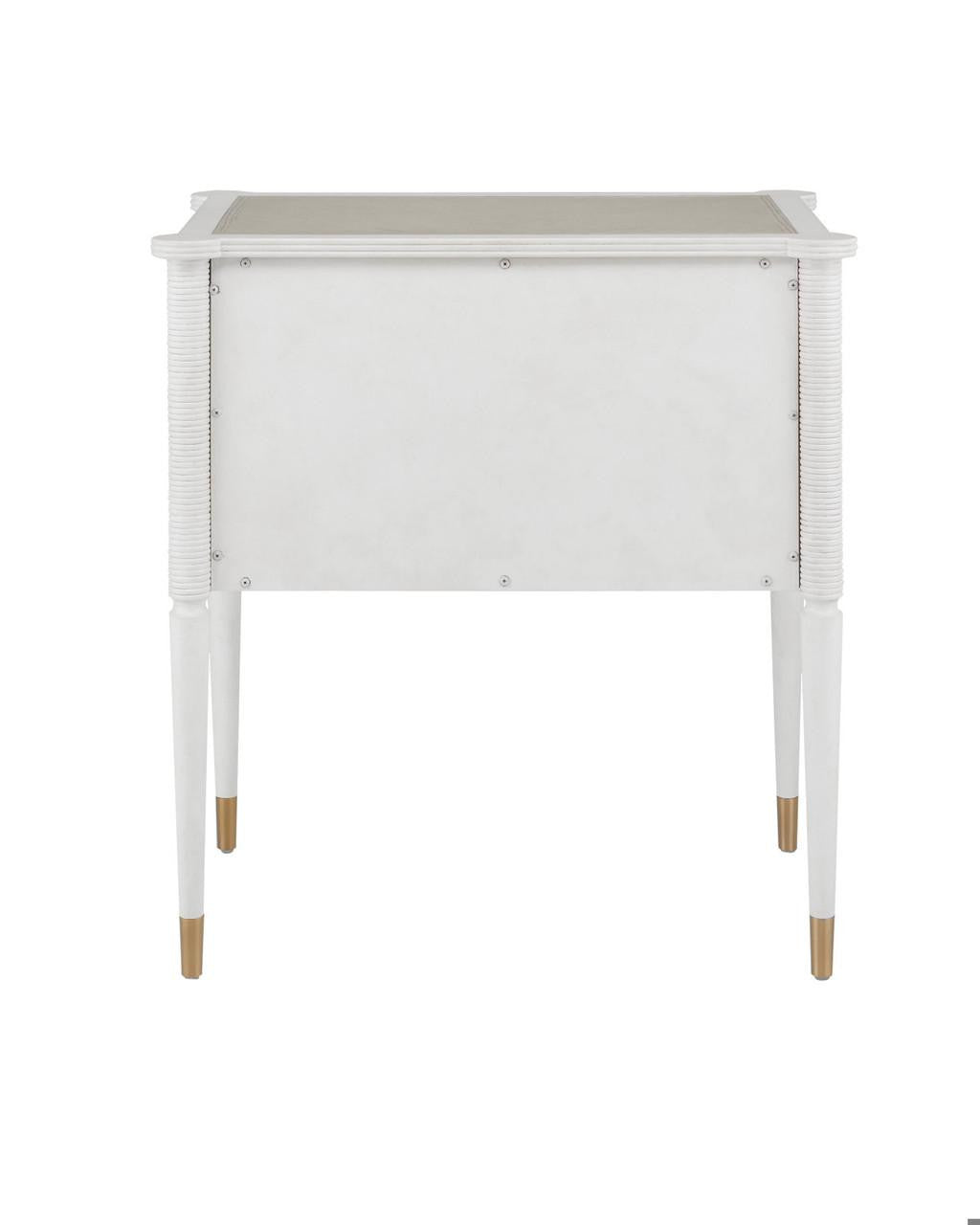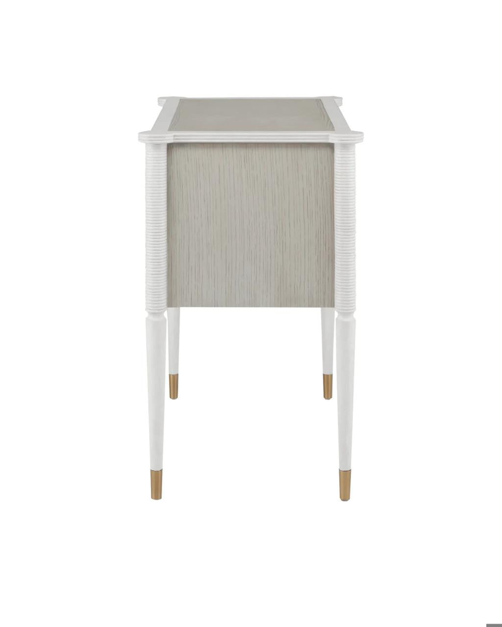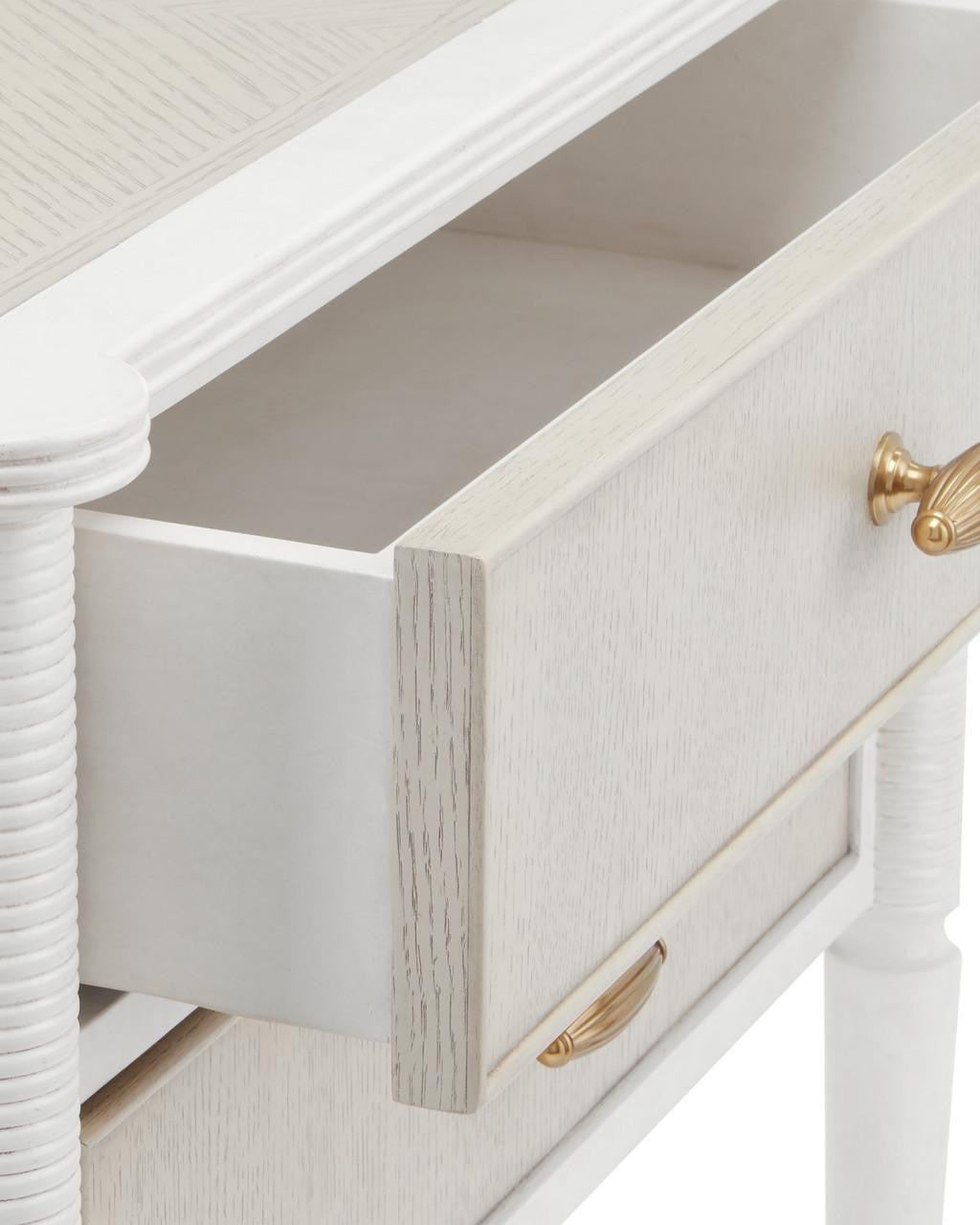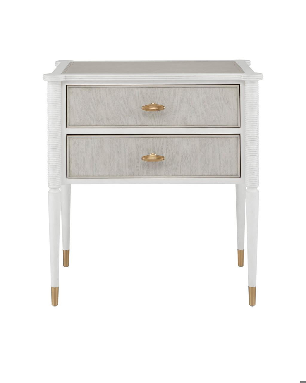 Made of mahogany and oak in a mix of off white and fog finishes, the Aster White Nightstand was inspired by an antique from the Winterthur Museum. The gray and white nightstand has two drawers on which the brass pulls are warm accents in a brass finish.
