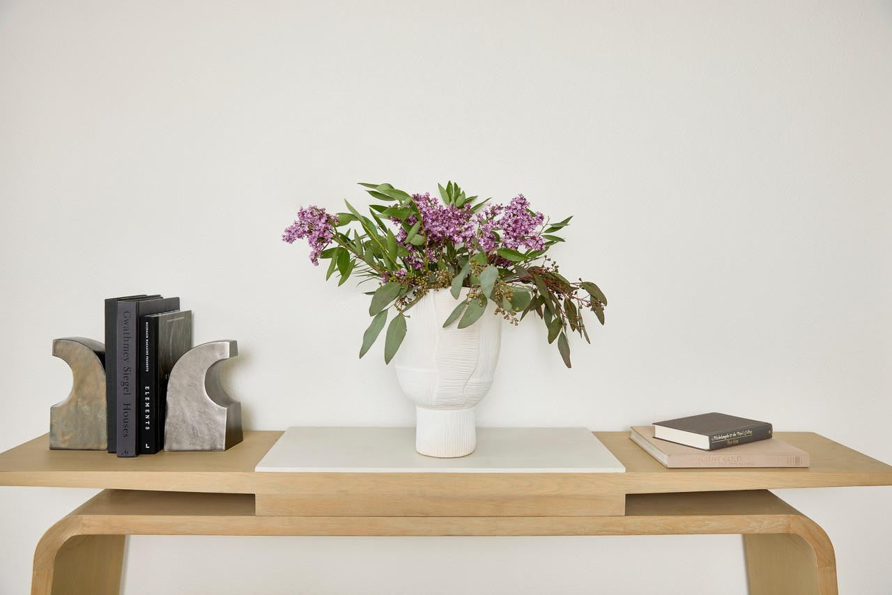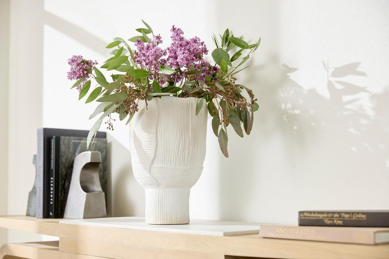 The Astreae bowls and vases are forged from ceramic with a white finish. A sand-like texture and subtle linear pattern give this series a look that is allusive to a Grecian retreat. Place altogether in an entryway or individually atop an accent table in your dining room.