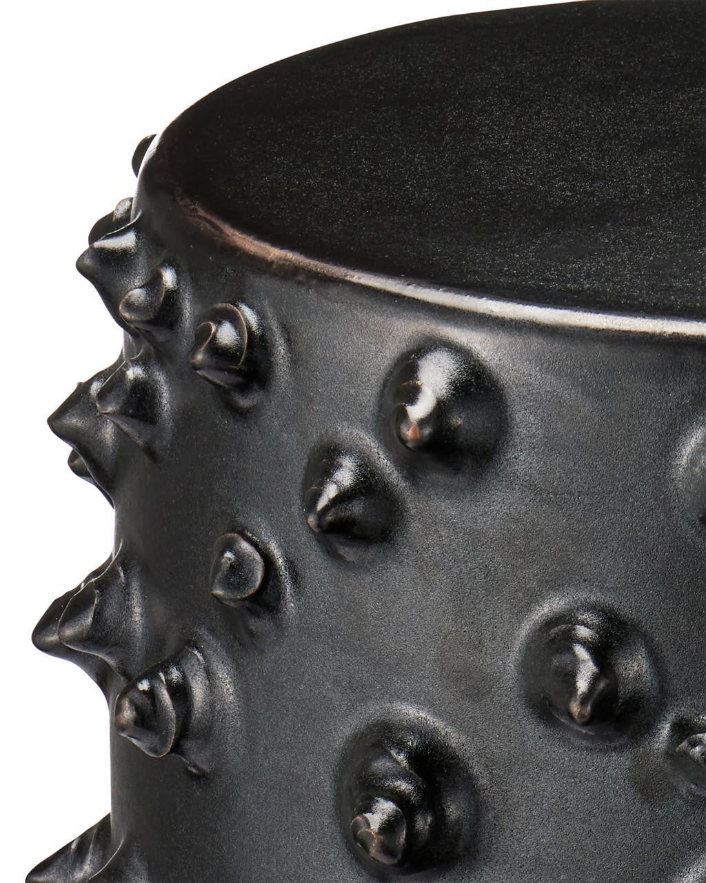 The Baltz Black Accent Table is made of ceramic covered in a rich black glaze. The protrusions that form the dimples on the sides of the table are done by hand by a group of women artisans who live at the border of Burma and Thailand. Then the black glazing is applied. This table is weather-worthy so it can be placed outside.