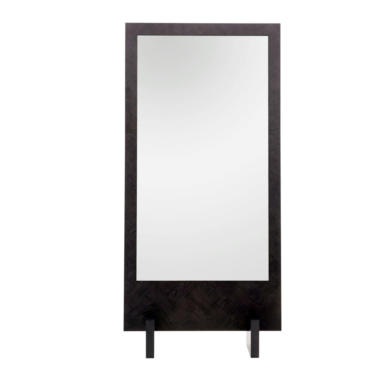 Check yourself! this full length mirror with an ebony oak wood veneer frame is strength in character. Float it in a room on it's stand or hang it on the wall. security cleat hanging hardware.
