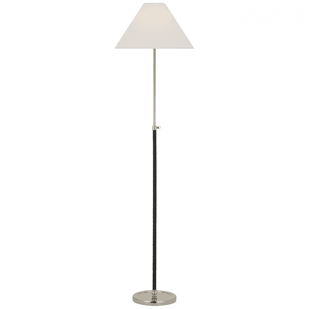 The Basden Adjustable Floor Lamp from Visual Comfort Signature brings timeless elegance with a natural twist to your interior space. Designed by Chapman & Myers, it features a slender metal frame wrapped in handwoven rattan for added texture and warmth. A cone-shaped linen shade tops the piece, diffusing light into a soft, ambient glow. Its adjustable height and compatibility with an ELV dimmer (sold separately) make it as functional as it is stylish—perfect for reading nooks, living areas, or cozy corners in need of refined illumination.
