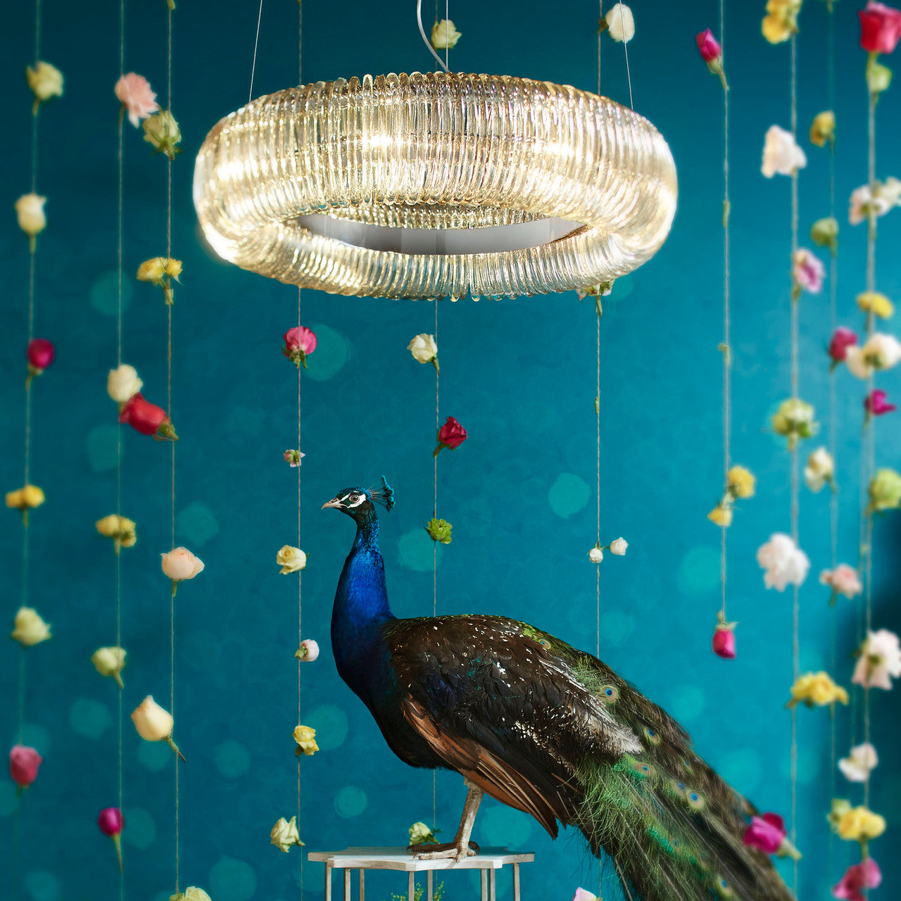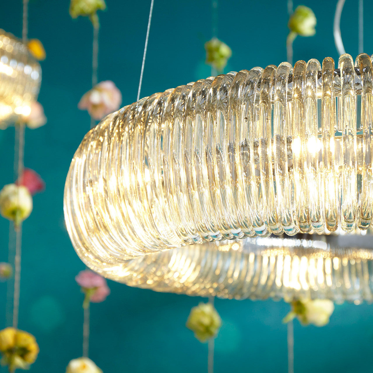 The Beaming Around pendant is a luminous hoop. The round chrome frame is ornamented by single glass rings that alternate in finish from clear to cognac, a subtle detail that blends the two perfectly but still adds a deliberate decorative variation. Ten foot adjustable cables allow for a great range of variability to suit almost any space.