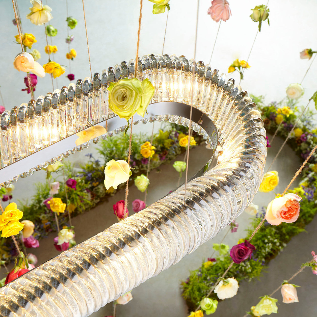 The Beaming Around pendant is a luminous hoop. The round chrome frame is ornamented by single glass rings that alternate in finish from clear to cognac, a subtle detail that blends the two perfectly but still adds a deliberate decorative variation. Ten foot adjustable cables allow for a great range of variability to suit almost any space.