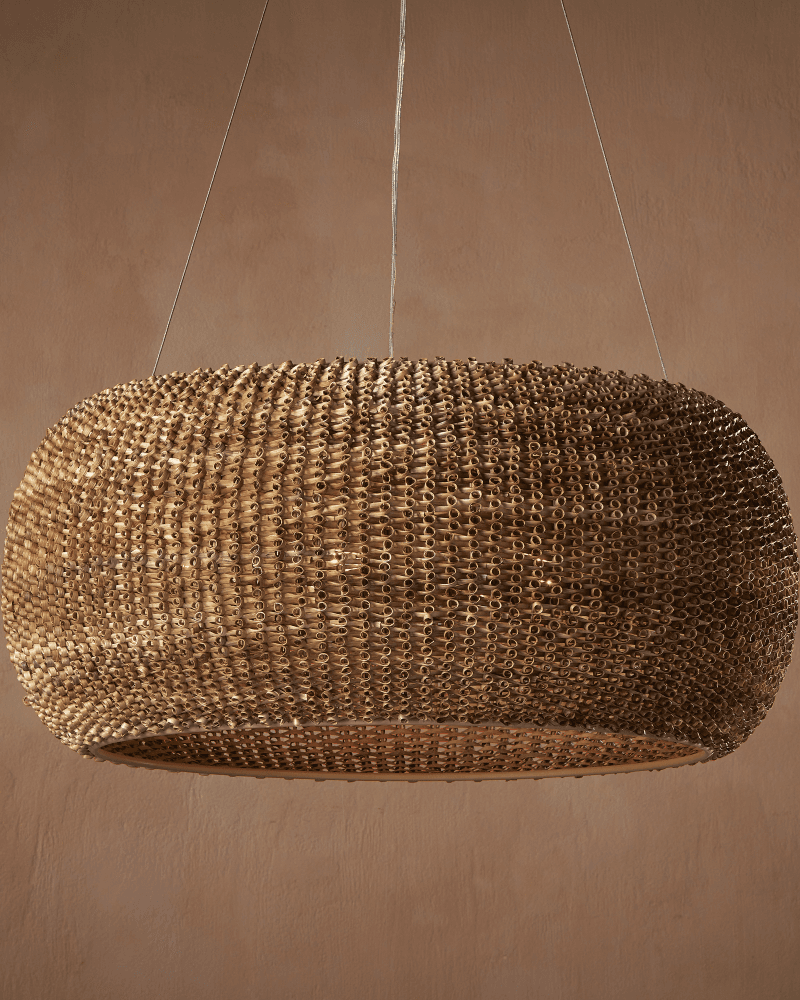 Made from a process that is similar to quilling with paper, the Boucle Chandelier is fashioned from looping natural rattan that has textural curls on the edges. This is a complex weave that is incredibly time-consuming to achieve with the level of consistency that creates a seamless shade. Wrapped around a wrought iron frame in a beige finish, the rattan chandelier will bring great warmth to a space. Adjustable from 36" to 158" with use of included chain/rod kit/cable. If your space calls for a longer drop, additional chain/rods/cable is available for purchase.