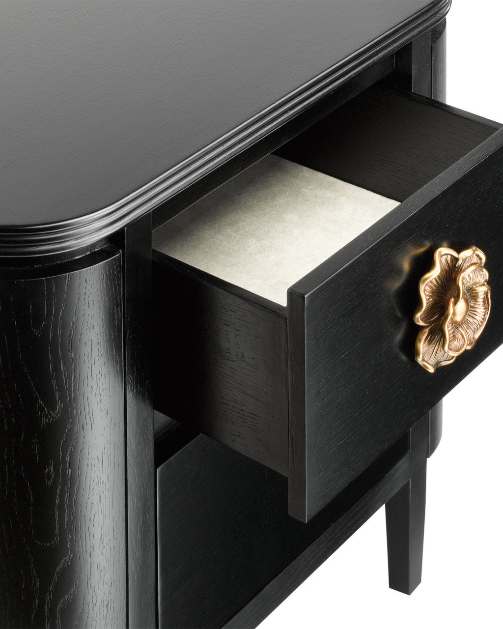 Stunning in its simplicity of lines and its artful hardware, the Briallen Black Nightstand has an elegant Caviar black stained wood and an impressively sized brass flower pull that steals the show. The stylized floral accent that serves as the pull makes this cabinet a bit of haute couture for a space. Place it in a beautifully designed boudoir for its form and function. We also offer the black Briallen in a Demilune cabinet, and in a nightstand and Demilune in gray.