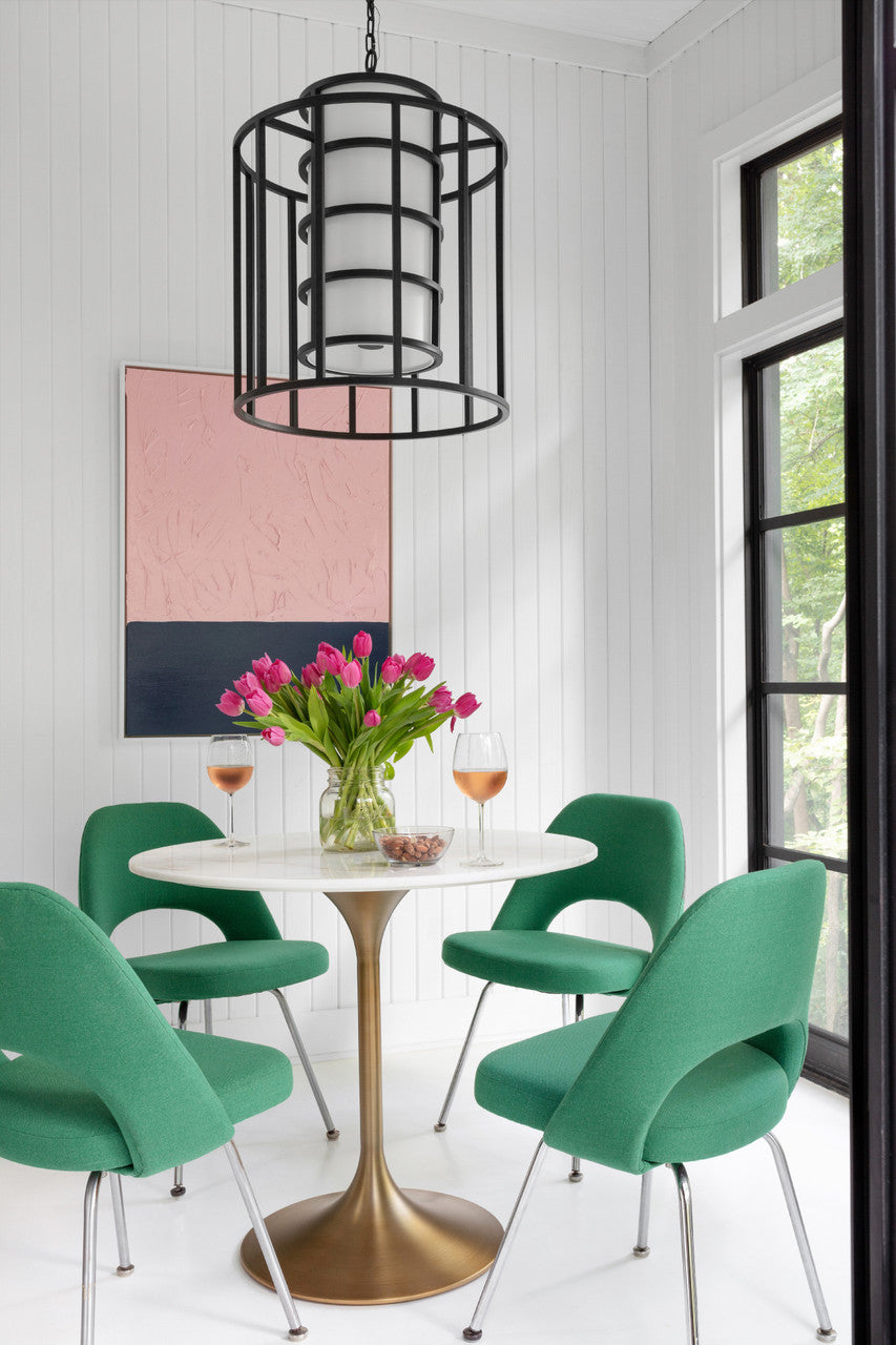 Bring style and substance to your favorite indoor space with Brian Patrick Flynn's Hulton Collection. Inspired by the shape and scale of classic drum chandeliers, the Hulton Collection adds a unique geometric twist to the category by incorporating a shade-less black metal drum form around the perimeter of the inner white silk drum shade. With its strong sculptural qualities and bold graphic lines, the Hulton Collection is the perfect statement piece for any room.