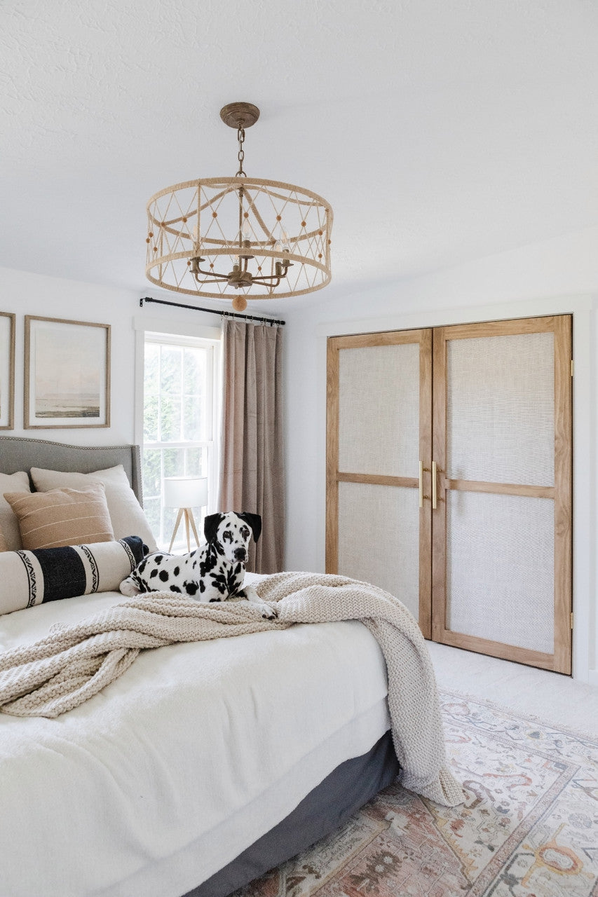 The versatile Briton collection works with traditional, modern, and bohemian rooms. Its open weave drum shape of natural jute and cork beads, create a visual impact and provides an easy way to add texture to the space.