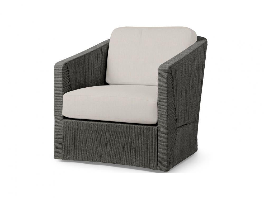 Kirk Nix Collection. Powder coated aluminum frame with hand-woven synthetic rope in a coal finish featuring a 360 degree swivel mechanism. The all-weather UV-protected weave is resistant to cracking, peeling, fading and breaking. Chair comes with loose seat and back cushions.