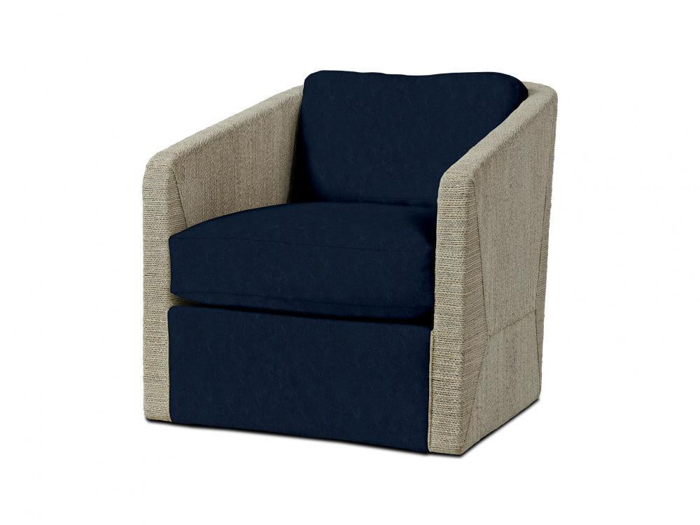 Kirk Nix Collection. Hardwood frame with hand-woven lampakanay rope in a two-tone fog white finish featuring a 360 degree swivel mechanism. Chair has an upholstered front apron with loose seat and back cushions.