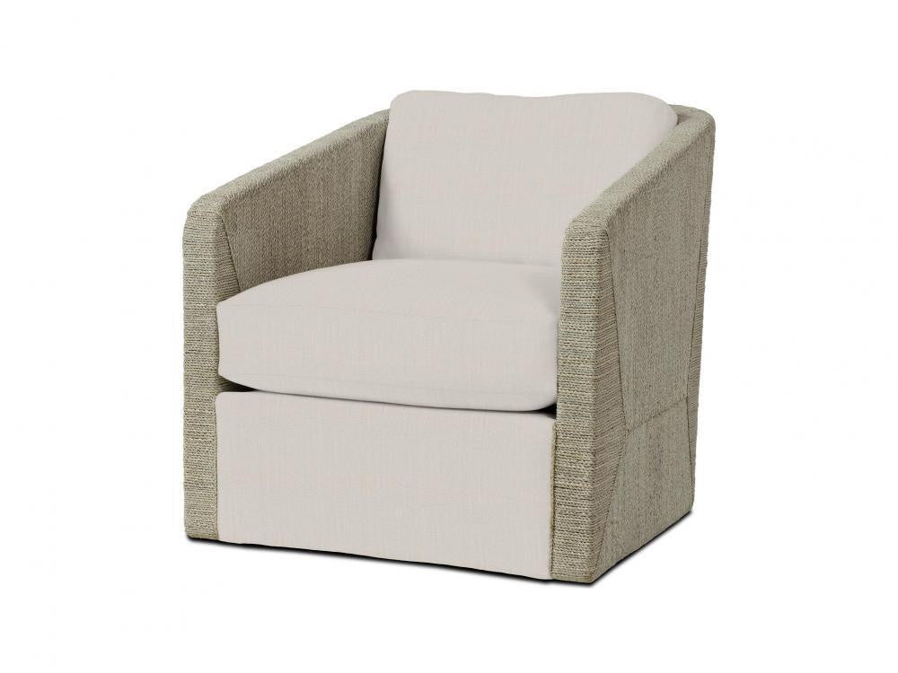 Kirk Nix Collection. Hardwood frame with hand-woven lampakanay rope in a two-tone fog white finish featuring a 360 degree swivel mechanism. Chair has an upholstered front apron with loose seat and back cushions.