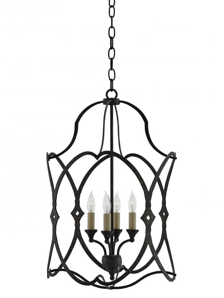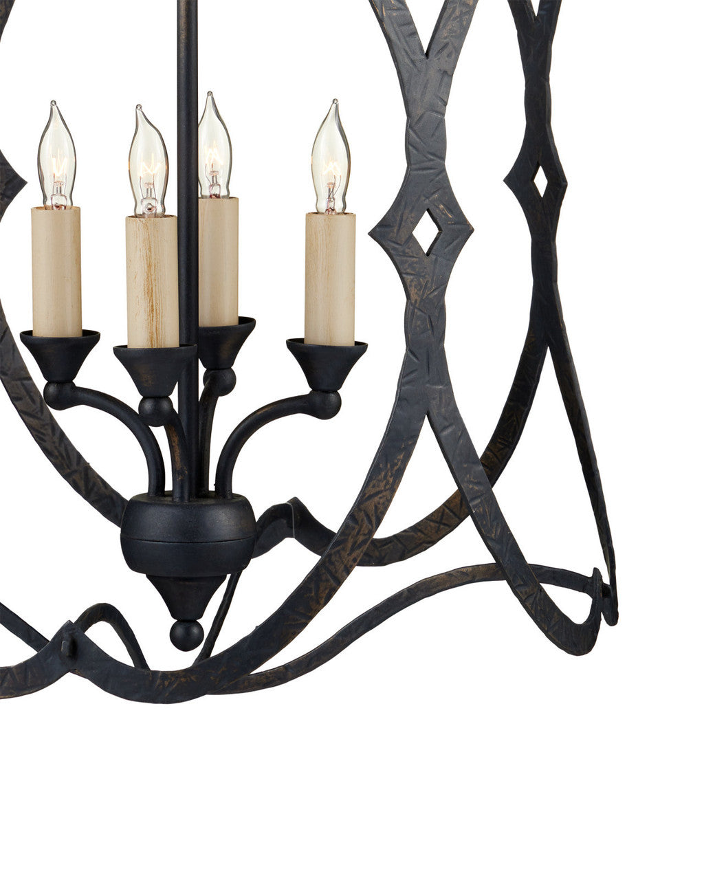 This exquisite work of wrought iron twists and turns to deliver a lithesome shape treated to a lovely French black finish. Where the arcing ovals meet, tiny diamond shapes bring added charm to the four-light fixture. This small version of the Charisma Lantern invites classic Italian flair into interiors. We offer this fixture in a larger lantern that has just as winsome a personality as this design does.