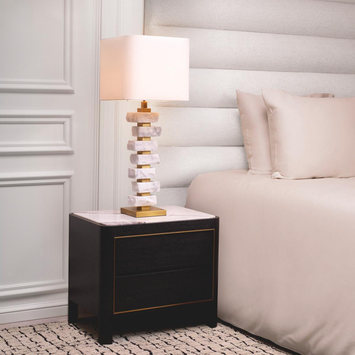 Bedside Table Corazon is a chic and organised nightstand. Wrapped in a charcoal grey oak veneer casing and embellished with an Italian bianco lilac marble tabletop, this beautiful piece will enhance the style of your bedroom. The drawers are framed by a brushed brass rim and offer ample storage space for books, phone accessories and the like.