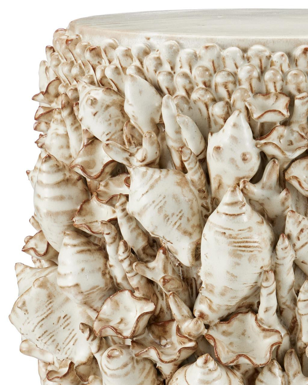 Though the Corfu Ivory Accent Table looks as if it is covered with lovely shells, the intricate shapes are actually handmade of ceramic. The table, which is also ceramic, has a round pedestal body that is shaped before it is covered with each of the shells, one at a time, by hand. This is a painstaking process. to complete the illusion that it is covered with sea-life, the surface has barnacle shapes on its top and bottom.