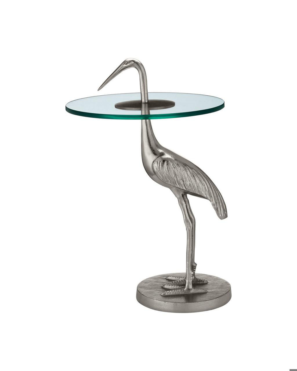 The Crane Silver Accent Table has an artfully realized bird that is made of cast aluminum covered in a nickel finish. The table is all the more whimsical given the glass top is fitted to the crane at a narrowing point on its neck. The table, which ships without the glass top in place, is easy to assemble, as the crane's head unscrews so the top can be inserted. The base edges have slight bevels on the top and bottom.