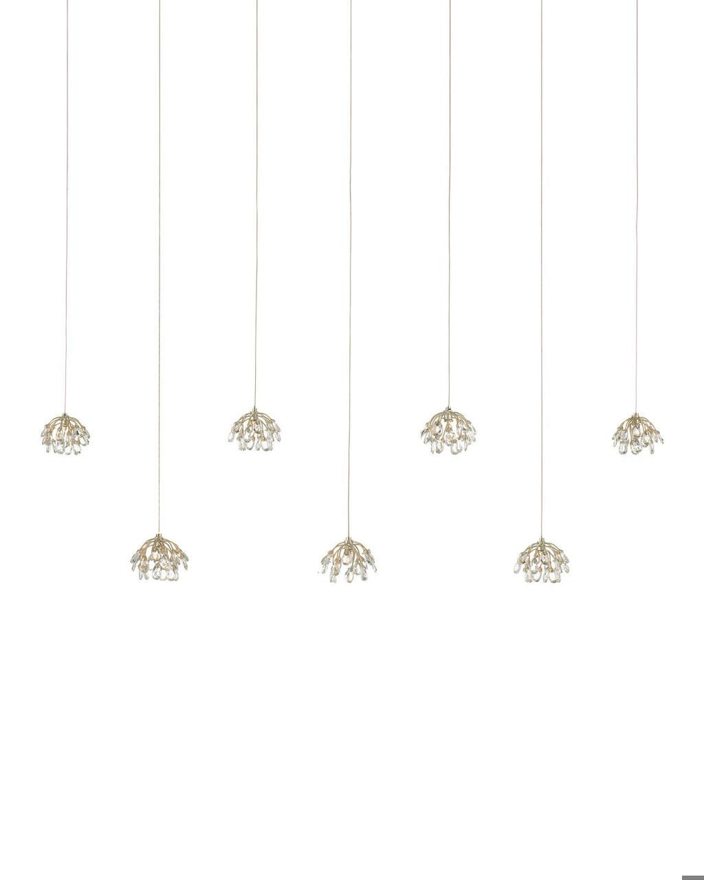 The Crystal Bud Rectangular 7-Light Multi-Drop Pendant dangles flowers made of delicate faceted crystals from its canopy to make the shades effervescent and graceful. The canopy of this piece is luminous in a painted silver finish. This fixture is among Currey & Company's multi-drop pendant collection, which includes multiple configurations.