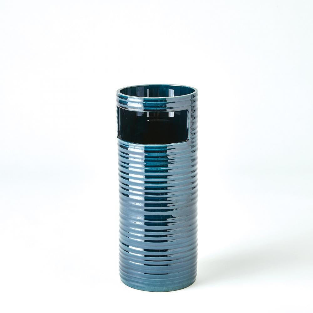 The Cut Out Vases are Portuguese slip-cast ceramics with a blue reactive glaze finish.