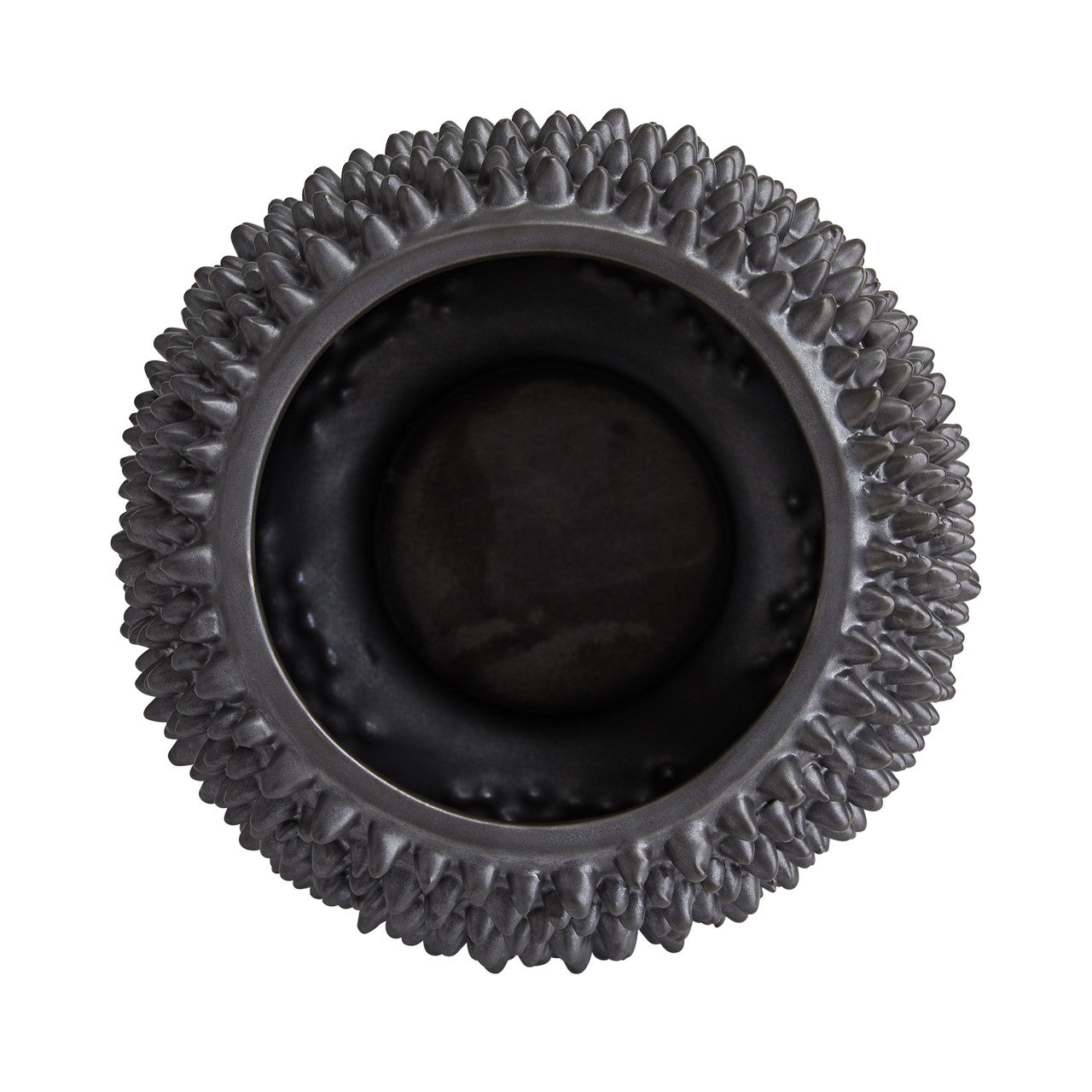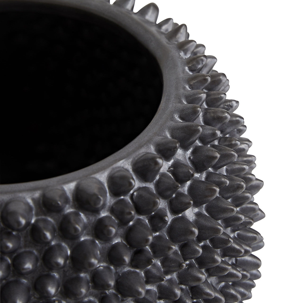 Sporting a heavily textured wildly unique facade the Daria is absolutely eye-catching. Ceramic is crafted in a fashion reminiscent of jackfruit with tiny spikes that cover its matte black-finished surface which is mounted on a matte black base We see this piece displayed with a bouquet of small blooms or showcased solo as an eccentric centerpiece. Pair with the shorter version to deliver an even more textural appeal. Watertight.