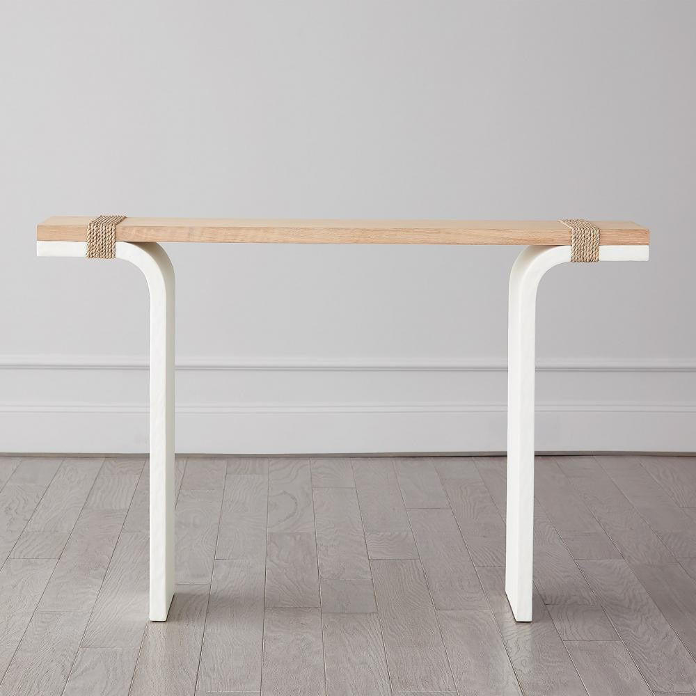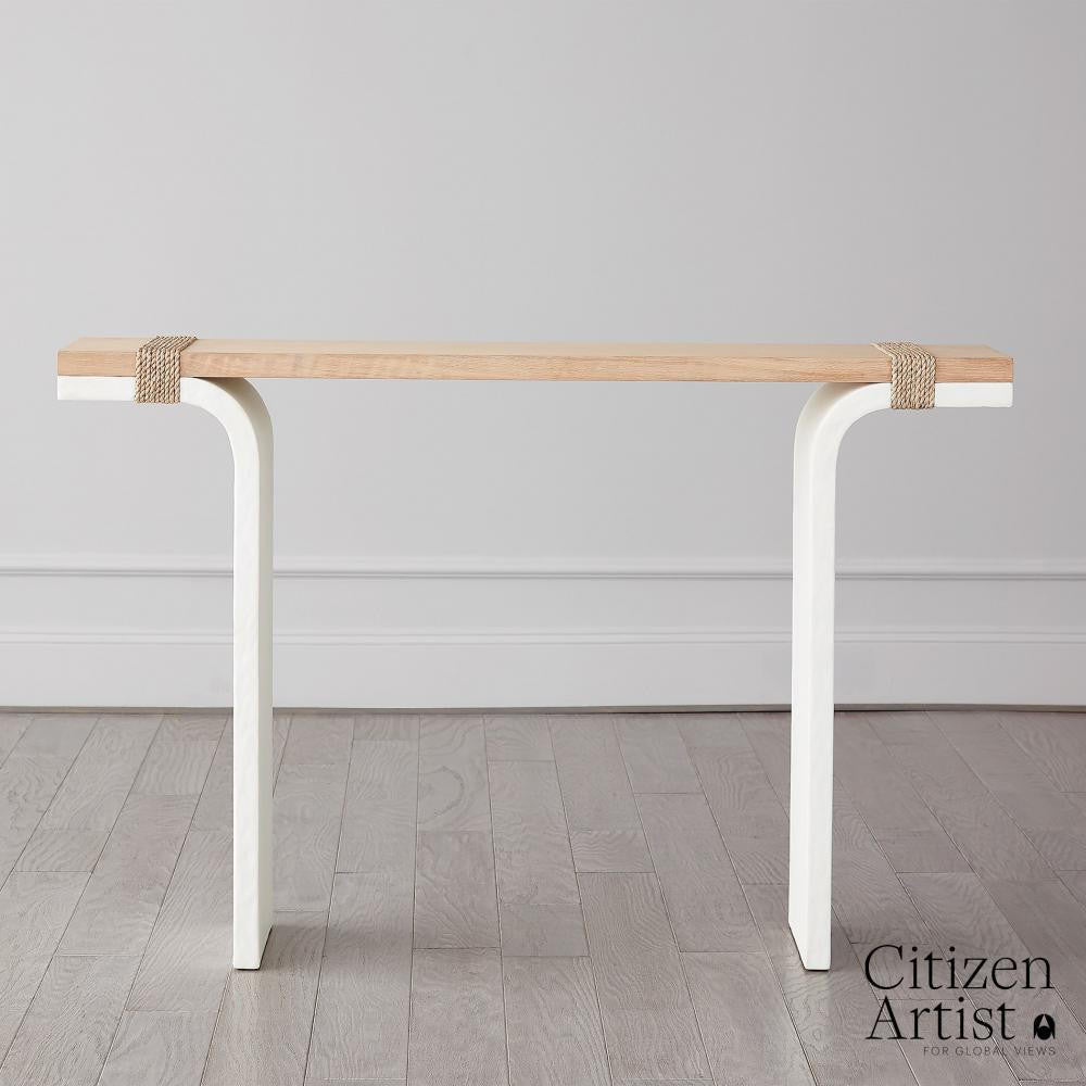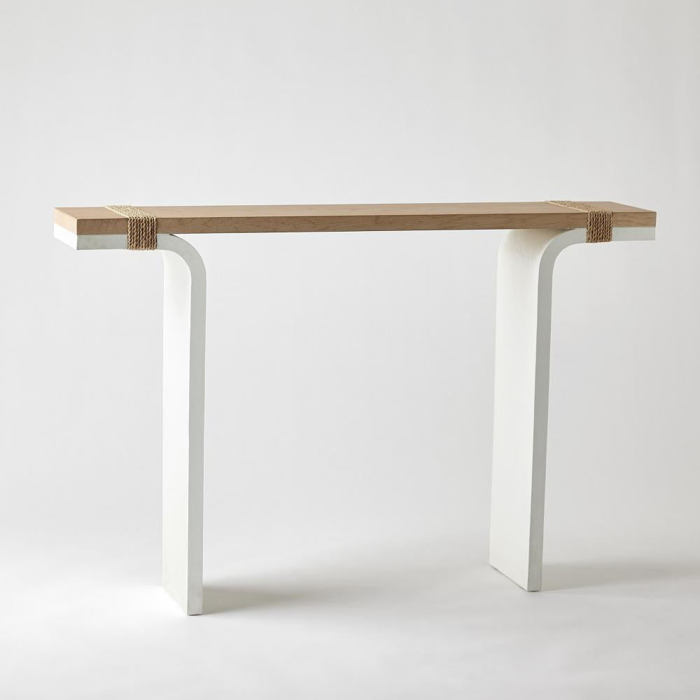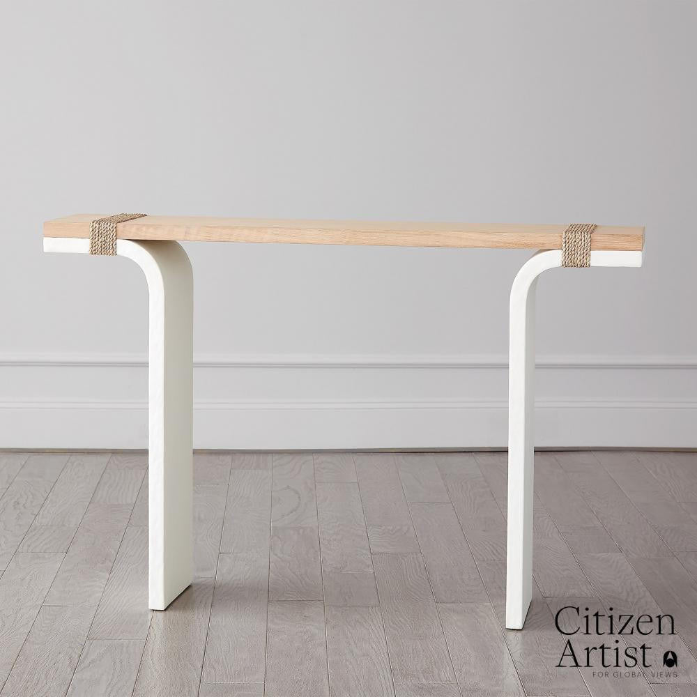 Organic abacca binds the white oak top to the gentle curves of the gesso legs of the Debby console. An expression of easy sophistication that draws inspiration from simple Japanese furniture forms and classic Belgian materiality, the Debby is at home in any environment.