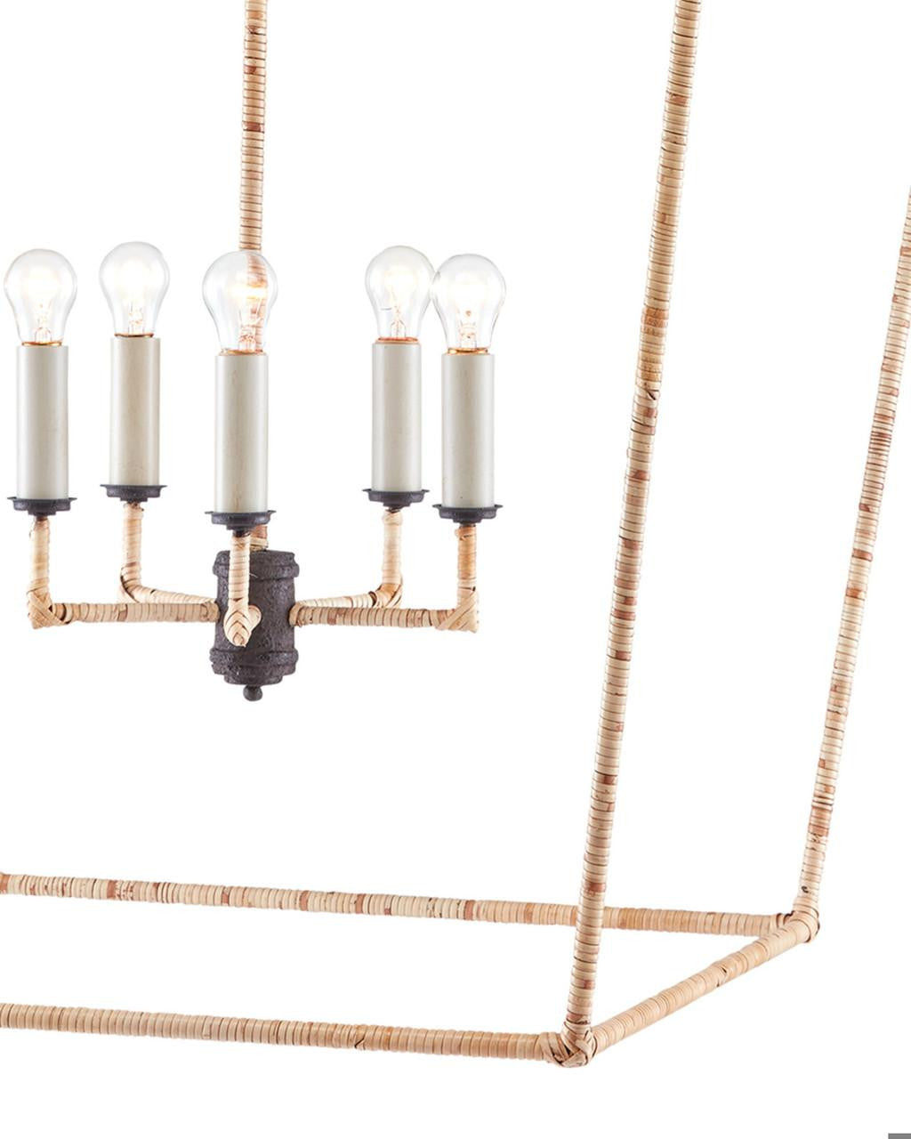 The Denison Grande Natural Lantern is a hammered wrought-iron fixture in a Mole black finish that is wrapped in rattan. The classic lantern shape has stood the test of time to make it one of our most popular offerings. A design element of note is the square that fastens the lantern to the chain. Adjustable from 53.5" to 122.5" with use of included chain/rod kit/cable. If your space calls for a longer drop, additional chain/rods/cable is available for purchase.