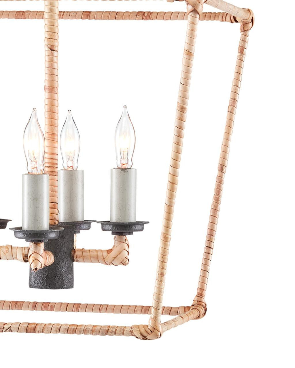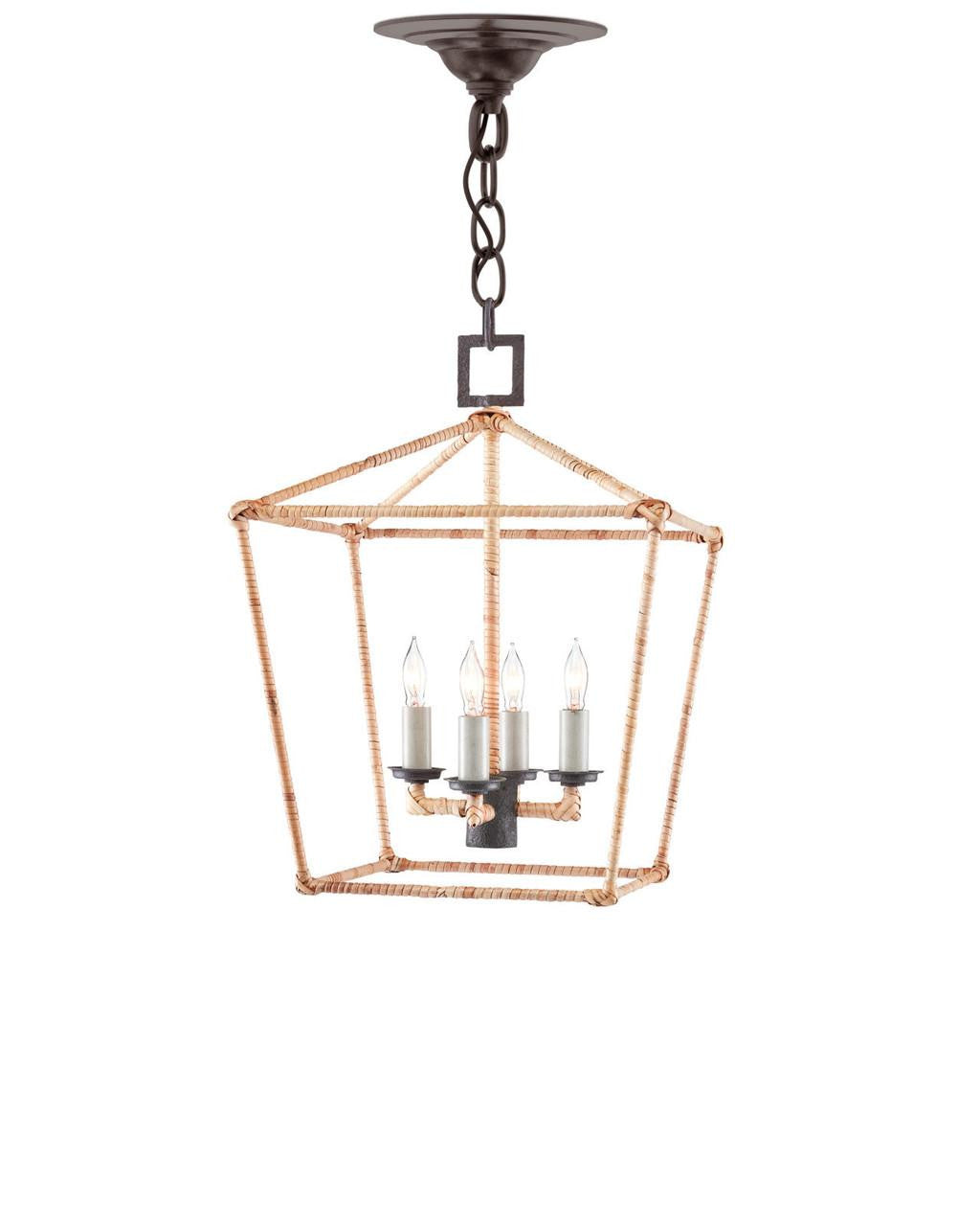 The Denison Small Natural Lantern is a hammered wrought-iron fixture in a Mole black finish that is wrapped in rattan. The classic lantern shape has stood the test of time to make it one of our most popular offerings. A design element of note is the square that fastens the lantern to the chain. Adjustable from 20" to 92" with use of included chain/rod kit/cable. If your space calls for a longer drop, additional chain/rods/cable is available for purchase.