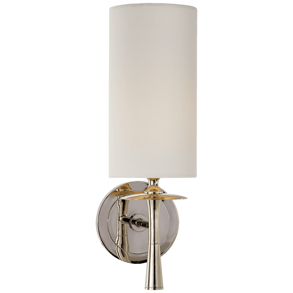 The Drunmore Single Sconce by AERIN combines traditional design with contemporary detailing. The modern design is finished in solid bronze or bronze with crystal detailing, and the elongated shade in either linen or white glass casts abundant illumination for hallways or bathrooms. Ideal as a pair or in multiples.