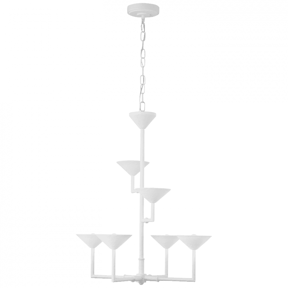 The Eleanor Chandelier from Visual Comfort Signature adds a touch of sophisticated elegance to any interior. Its angular arms gracefully hold champagne-inspired diffusers, with a globe of light subtly peeking through, casting warm, inviting shadows throughout your space. Designed by Julie Neill, this chandelier exudes contemporary charm with its tapered bobeches and refined details. Crafted from premium steel and acrylic, it combines durability with timeless style. Whether placed in a dining room, foyer, or living area, it elevates the ambiance with a sense of refinement. Suspended by a linked chain and ceiling canopy, it also offers dimming capabilities when paired with a separately sold ELV dimmer.