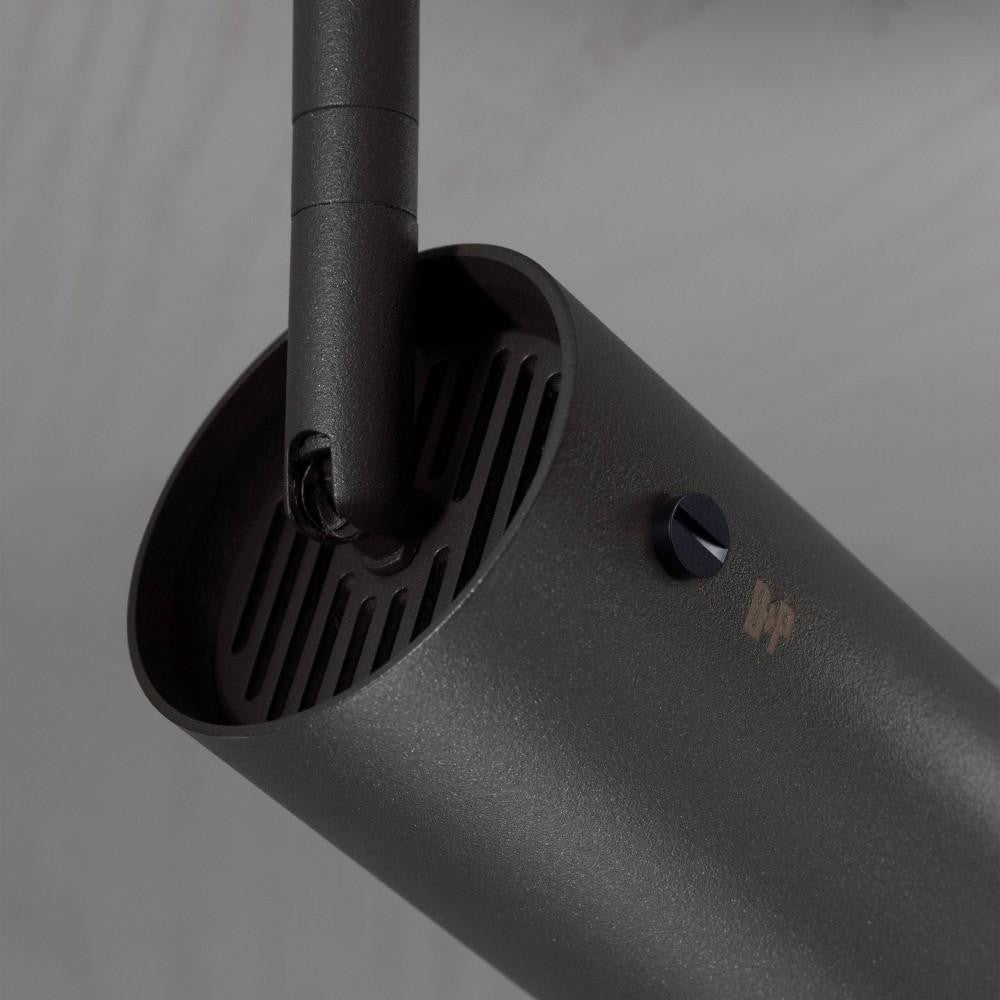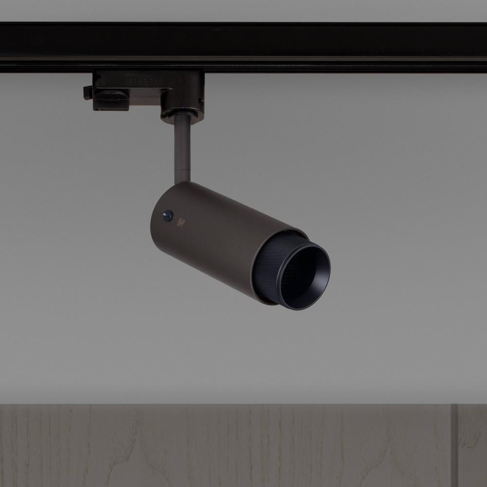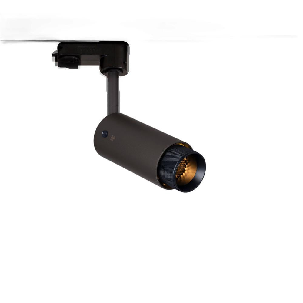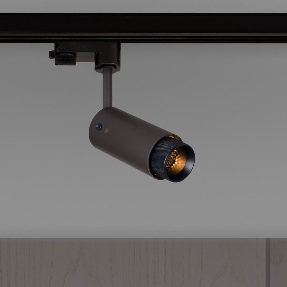A track spotlight made from graphite powder coated metal with solid steel, brass or gun metal detailing.