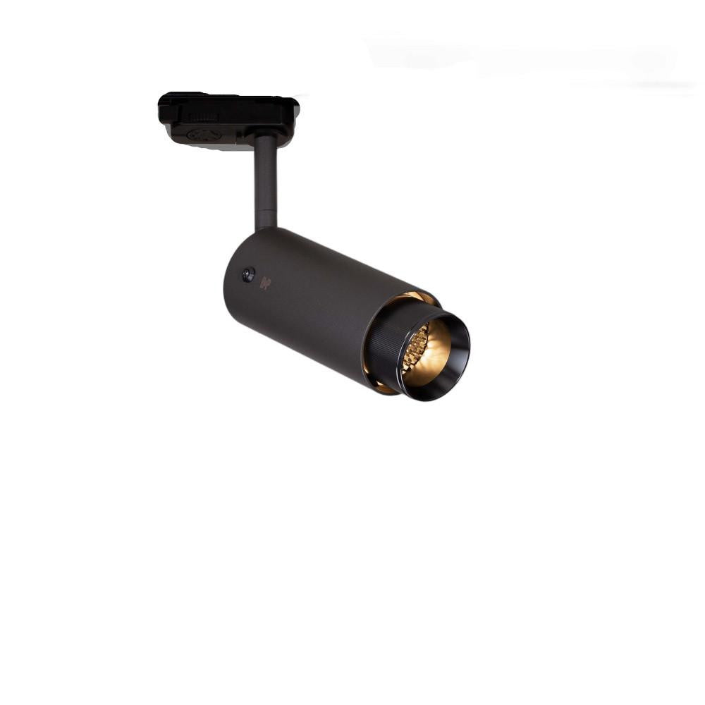 A track spotlight made from graphite powder coated metal with solid (Steel), (Brass) or gun metal detailing.