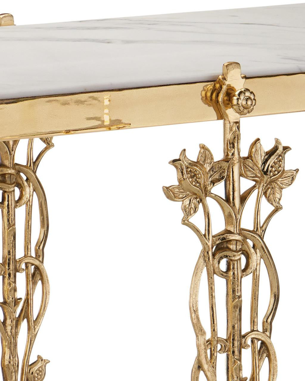Reflecting its beautiful name, which means flower in Italian, the Fiore Console Table has lovely floral motifs flowing up each of its legs toward a metal band into which a natural white marble top is inset. Just above the graceful ball-shaped feet, another shelf sits, the natural stone a crisp contrast to the luminous polished brass finish.