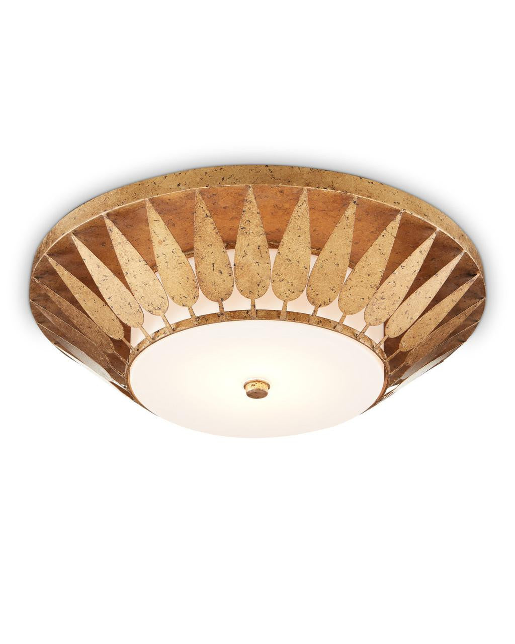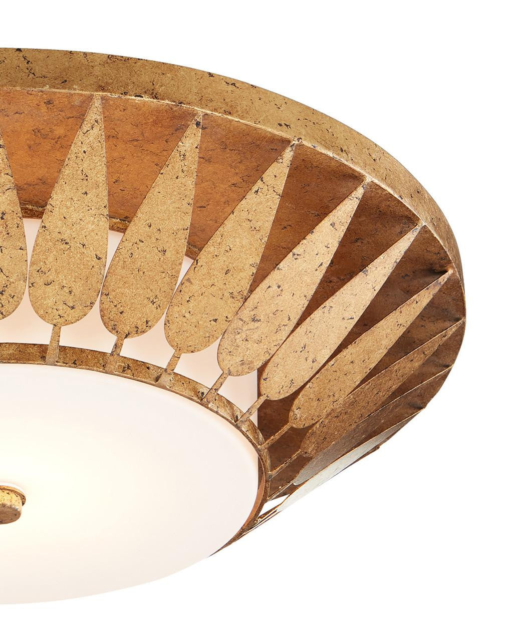 Made of wrought iron in a new gold leaf finish, the Floris Flush Mount has a fluted profile and a milky glass diffuser fastened by a pert finial. Our design team takes great pride in bringing style to flush mounts, a point of view we've developed over decades of creating ceiling lights and this gold flush mount is our latest iteration.