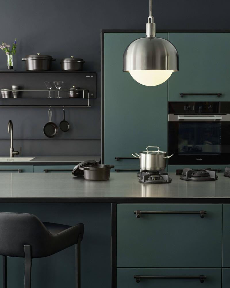 A light pendant and shade, combining machined, hand-spun and cast solid metal, all refined by hand. It features our cast forked detailing and signature diamond-cut linear knurling. The light comes complete with a handblown opal glass globe and Forked-specific dimmable Buster Bulb, casting a functional ambient light in this configuration.