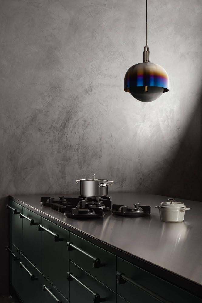 A light pendant and shade, combining machined, hand-spun and cast solid metal, all refined by hand. It features our cast forked detailing and signature diamond-cut linear knurling. The light comes complete with a handblown smoked glass globe and Forked-specific dimmable Buster Bulb, casting a soft decorative glow in this configuration.