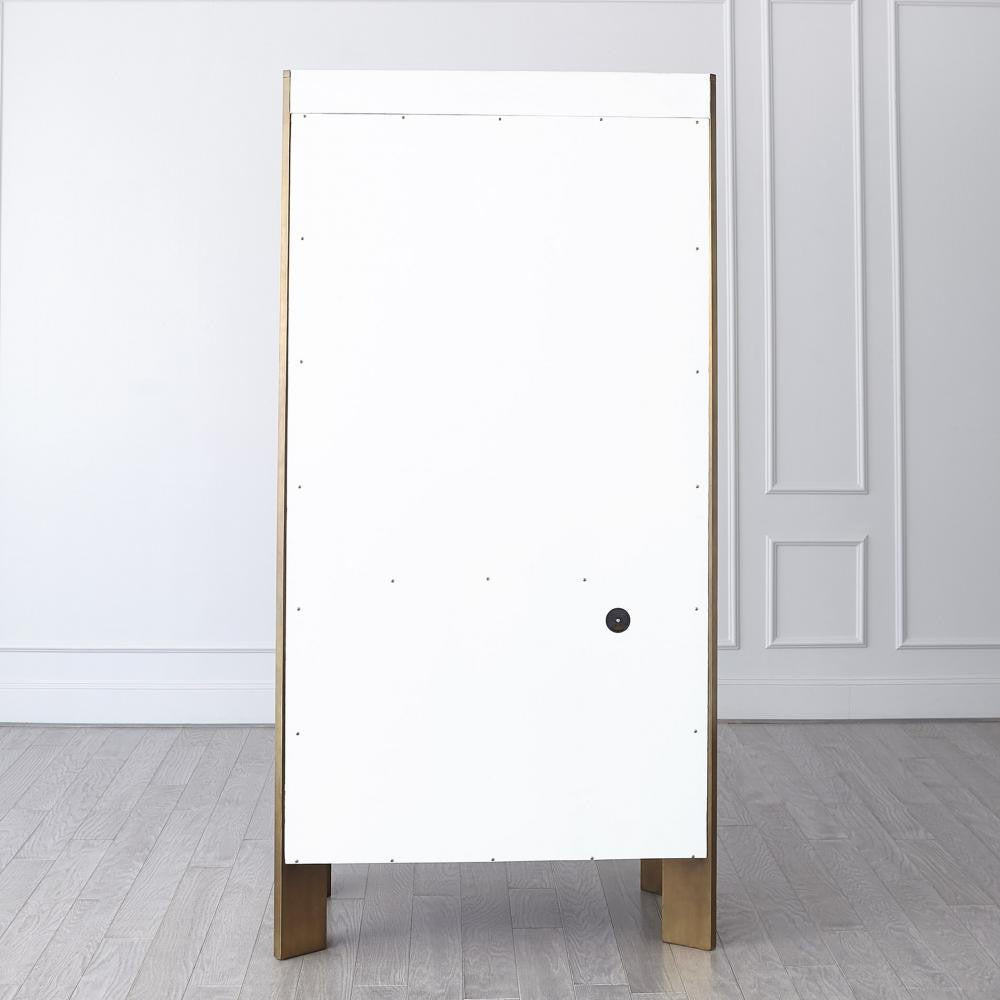 The Framed Tall Cabinet is made of hardwood construction with brass sheeting and cast resin panels, lined in American white oak with white marble counter and brass media grommet. Includes soft-close doors and drawers and glass shelves.