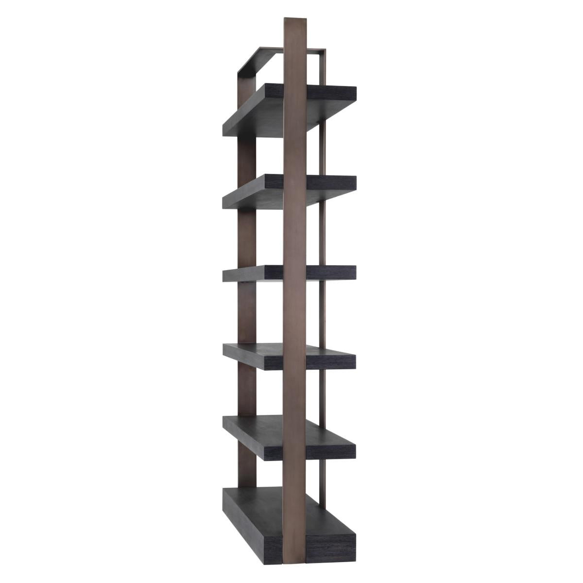 Give your books, plants and home accessories a home in the contemporary Geo Cabinet. This stylish and practical storage unit matches all modern decor styles and is useful in any room. Its sturdy metal frame has a bronze finish and contains 6 shelves in mocha crown oak veneer.