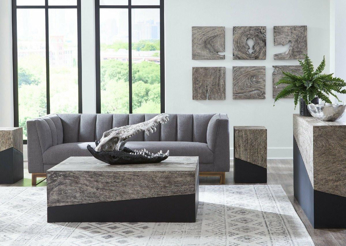 Playing around with shapes is one of the main implements in our tool kit at Phillips Collection. In combining the deepest black and natural wood on slant, as we have with our Geometry Square Gray Coffee Table, we've created a sophisticated profile that brings organic warmth and contemporary cleanness to a space. The surface variations of the woodgrain also bring texture into a room. We have a wide array of shapes in coffee tables, console tables, and side tables in this collection, as well as tables in a natural finish, and stools and wall tiles. Each of these reflects the ethos that we personify: modern organic.