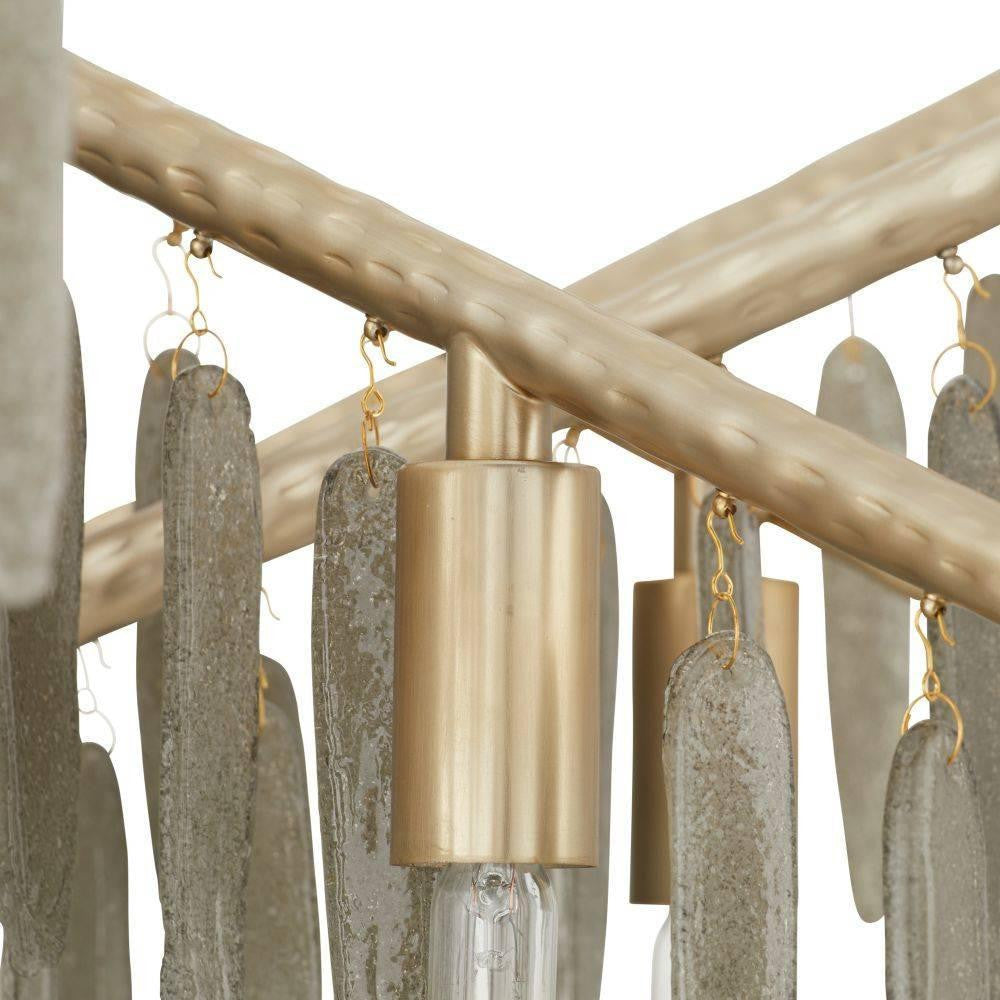 Inspired by icicles on an evergreen tree, accents of smoke seedy glass drip down from the branches of our dramatic chandelier. Every angular arm of our champagne hammered iron fixture has a faux bois texture, making it a spectacular sight even when not illuminated. Twelve bulbs disperse light throughout the room. Damp-rated, although limited covered outdoor areas may affect finish. Finish will vary.