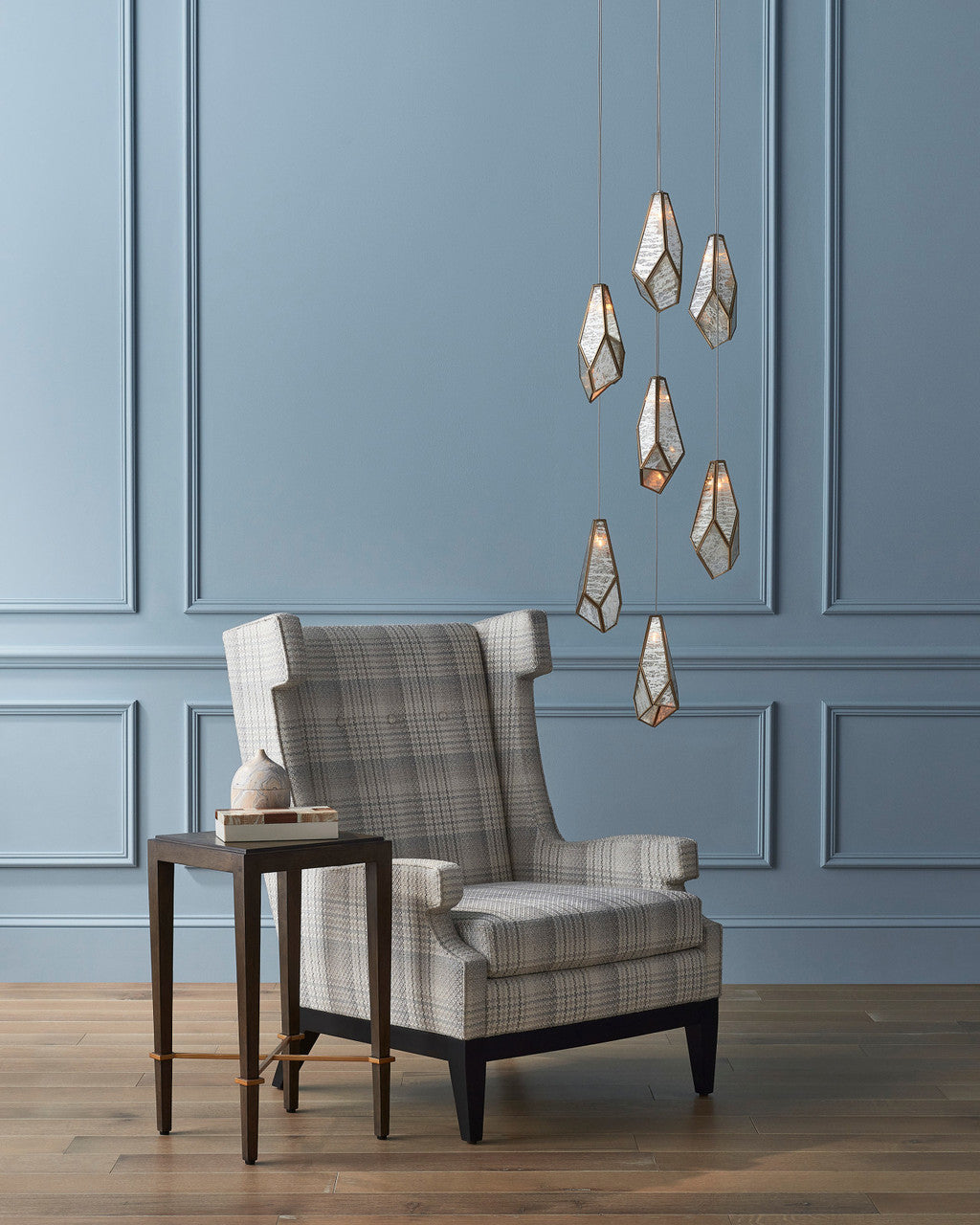 The faceted shades of the Glace 7-Light Multi-Drop Pendant are made of panes of Raj mirror joined with seams of metal in a brass finish. The organic shape of the shades and the fact they hang at differing heights brings this mirrored pendant added personality that will make it a piece of jewelry in a space. The canopy of this piece is luminous in a painted silver finish. This fixture is among Currey & Company's multi-drop pendant collection, which includes multiple configurations.
