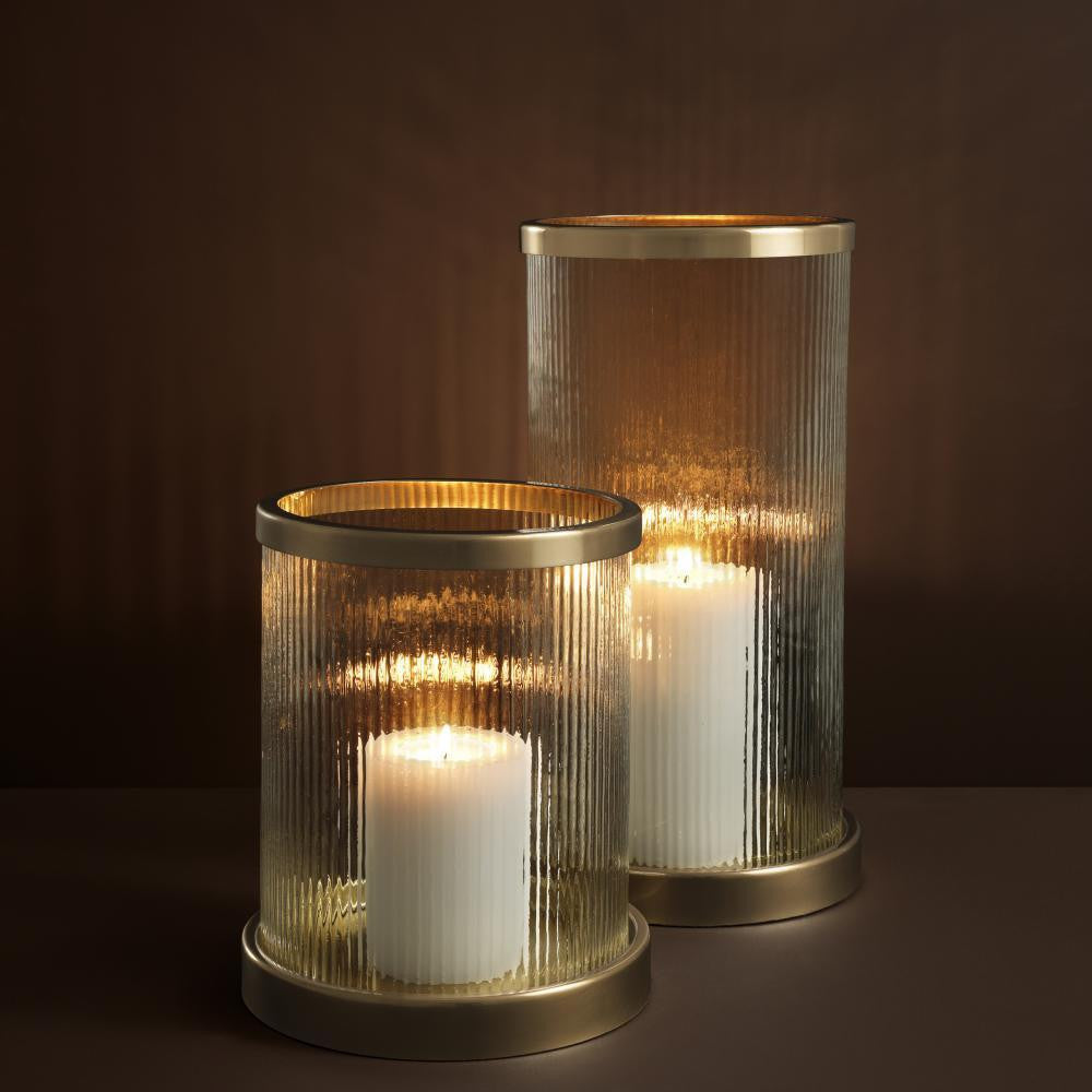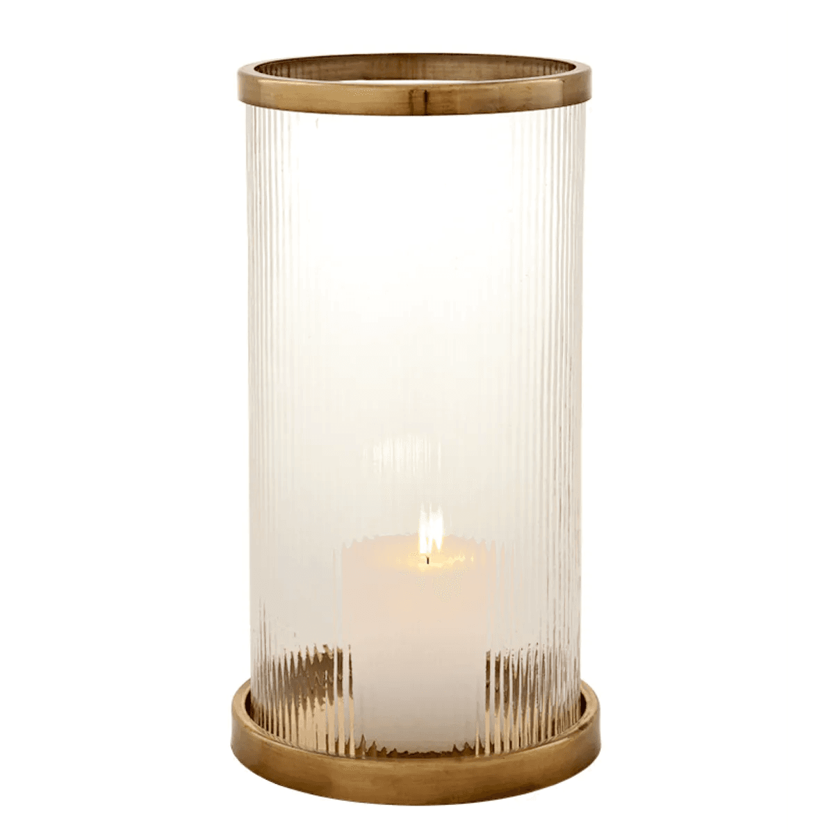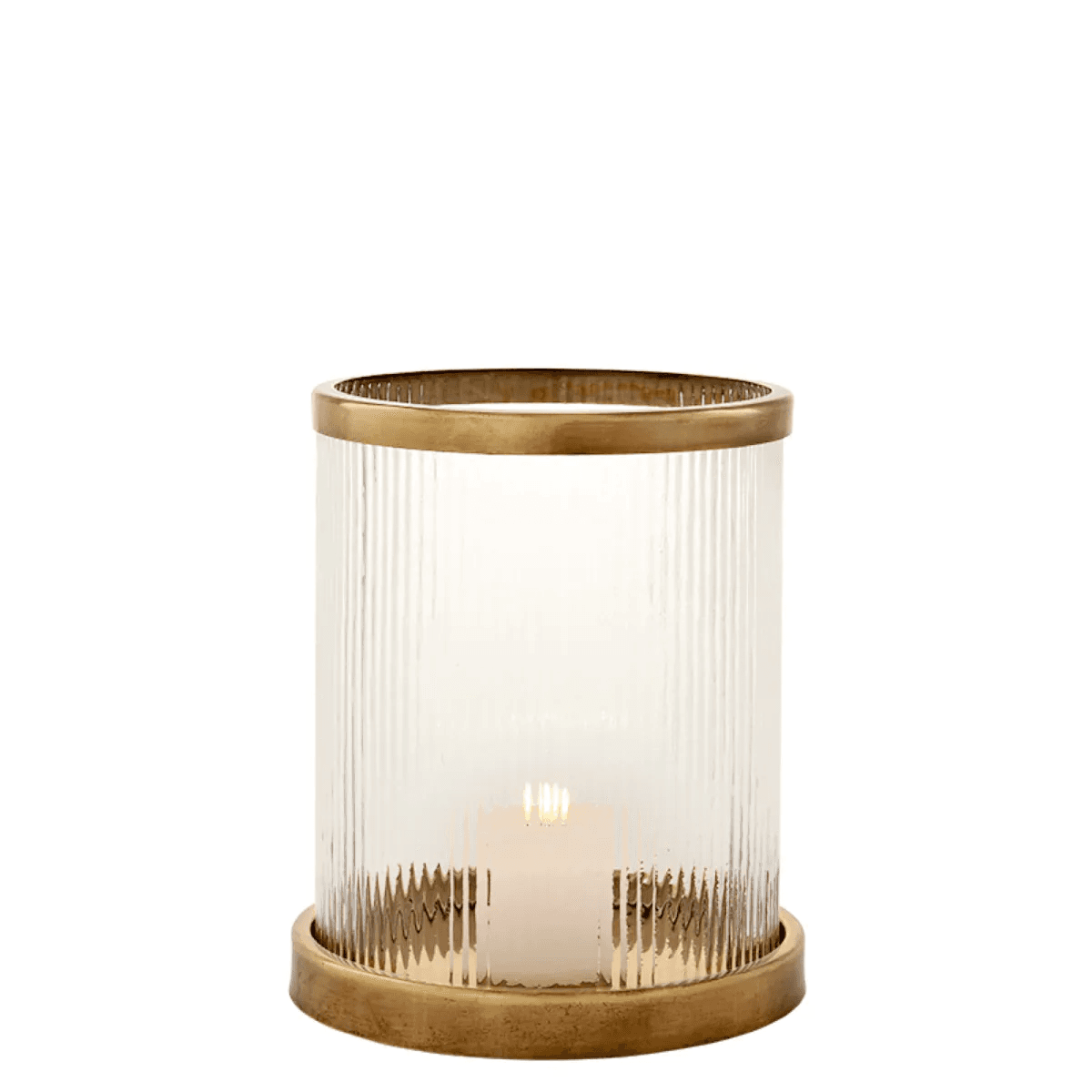 Enlighten your home Decor with the Hurricane Harrington S. Hand blown by skilled glass artisans, this vintage style candle holder features a cylindrical jar from ribbed cut glass and a base and rim in antique brass.