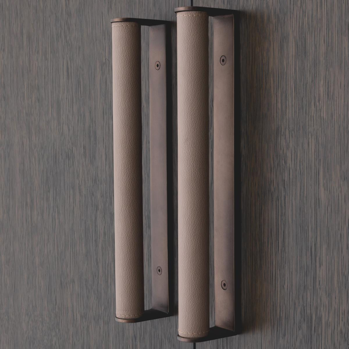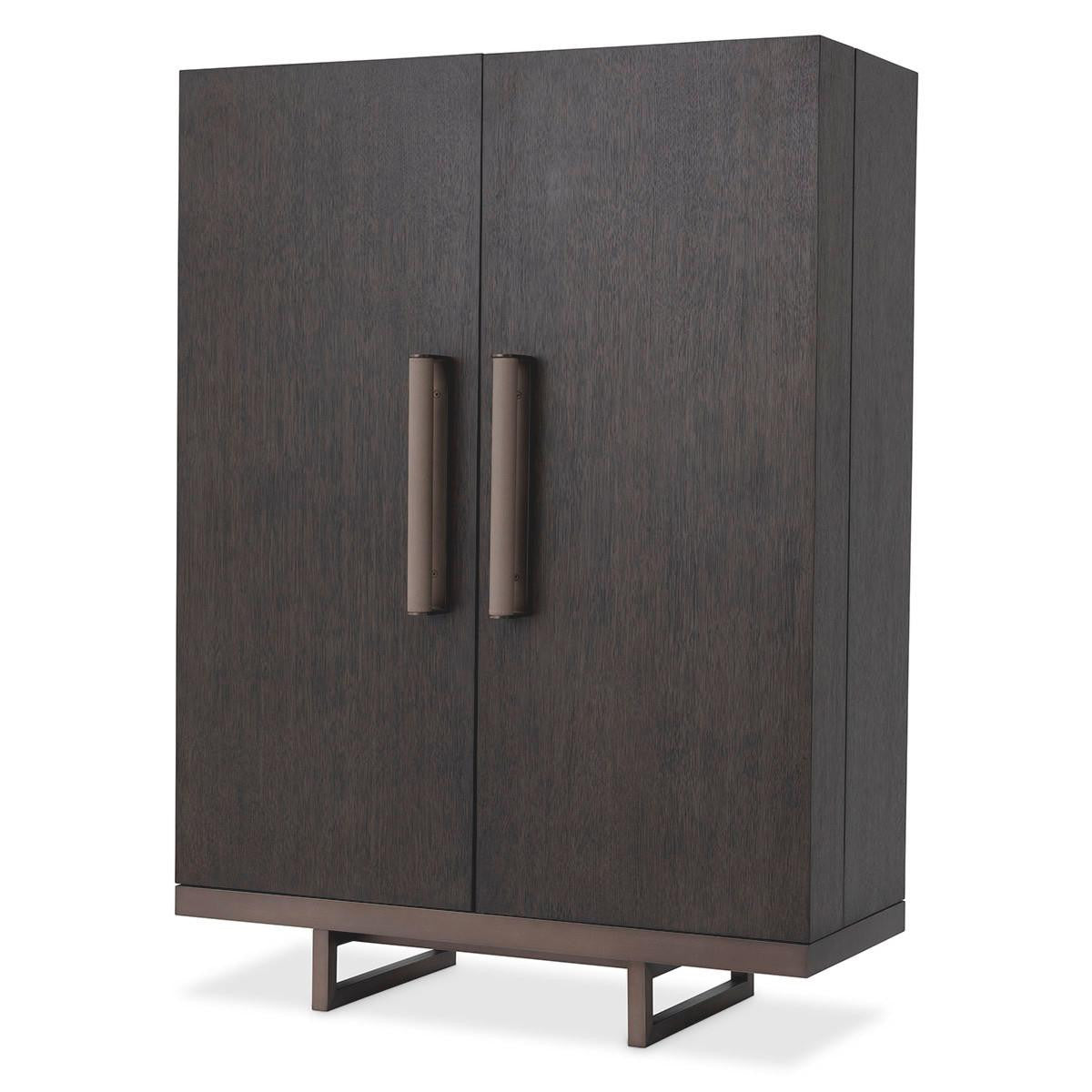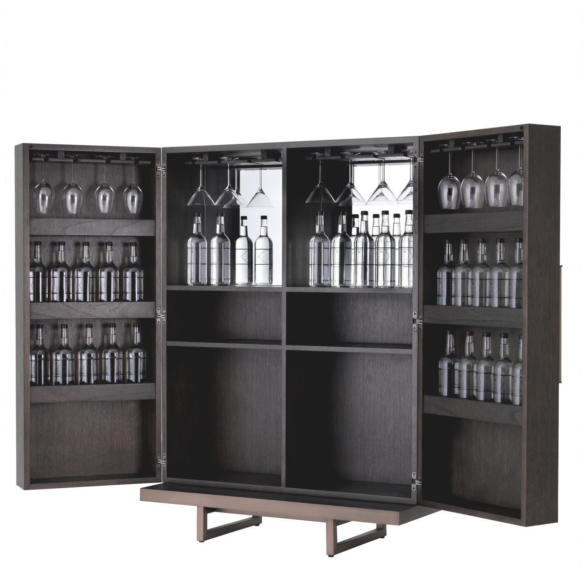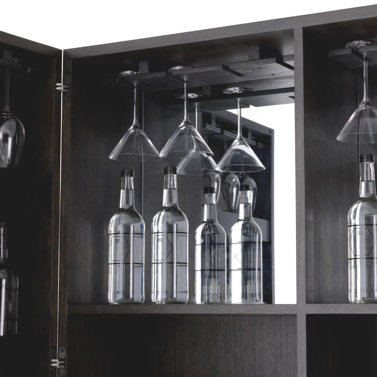 Featuring a modern mocha straight oak veneer cupboard, Wine Cabinet Harrison is a high quality storage solution for glassware, wines and liquors. The inside of the cabinet is fitted with mirror glass and contains 4 shelves. Each door has 3 shelves with a raised edge so that glassware cannot fall out when you open them. Furthermore, this cupboard has 4 hanging racks that together can accommodate up to 16 wine or cocktail glasses. Medium bronze hardware and leather look handles make this piece an important feature in your living room or dining room.