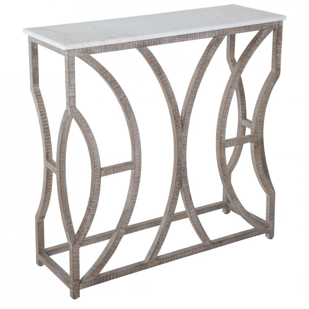 Bold converging wooden arches create the refined look of the Helen Console Table. This narrow console is composed of a neutral transitional combination of rustic washed oak & white marble. Marble is a natural material. Differences in color & pattern should be expected & celebrated.