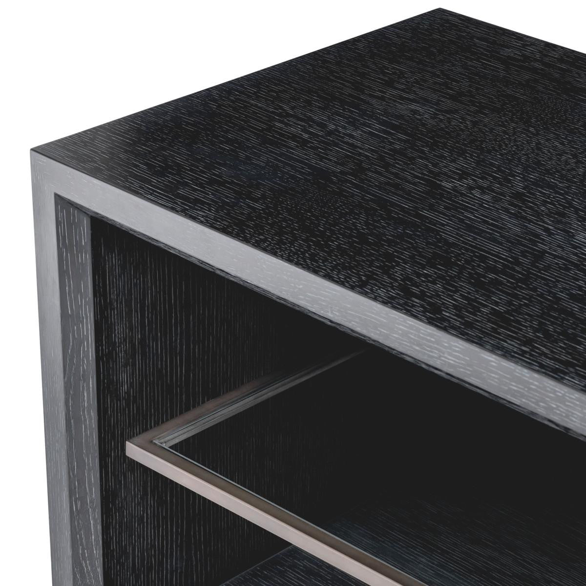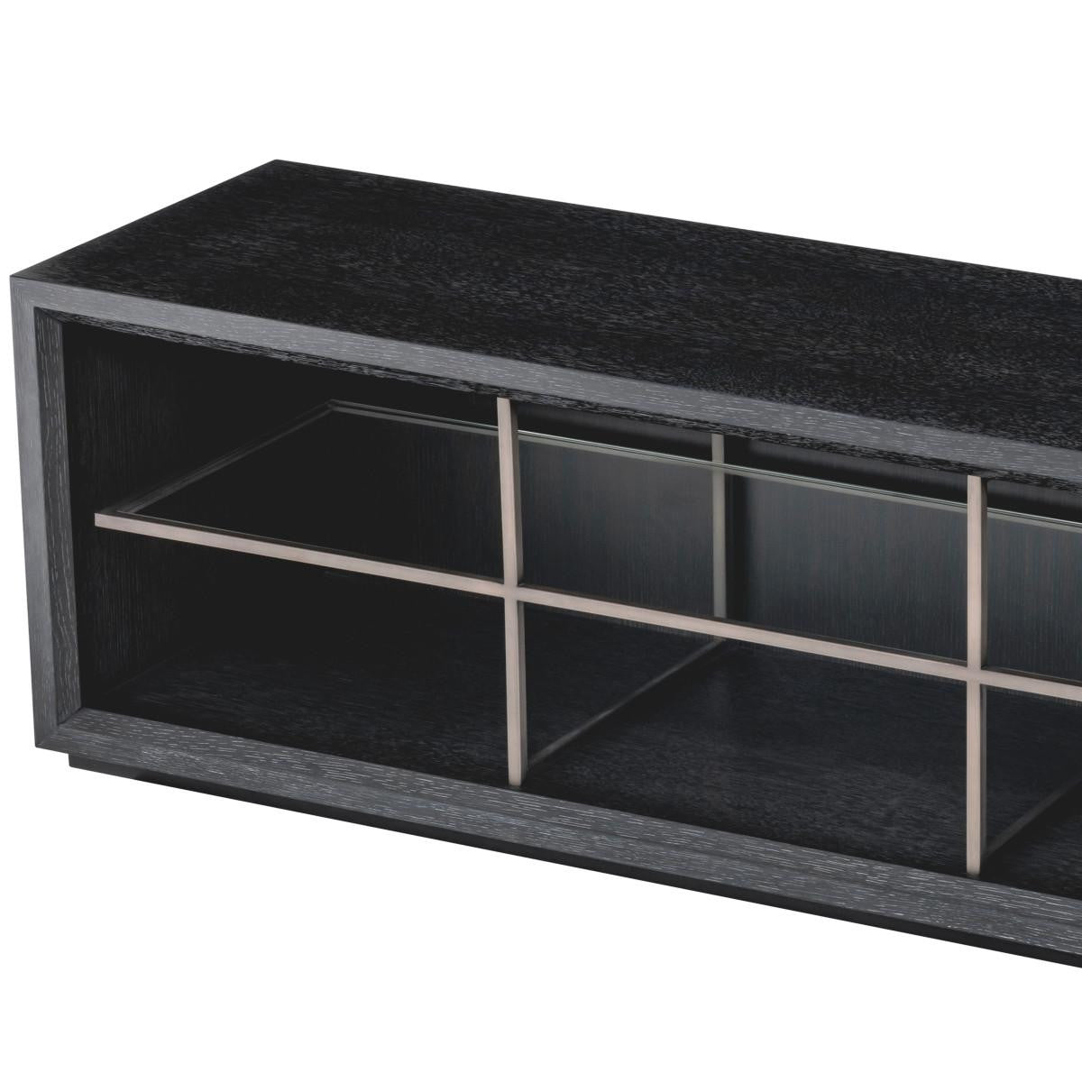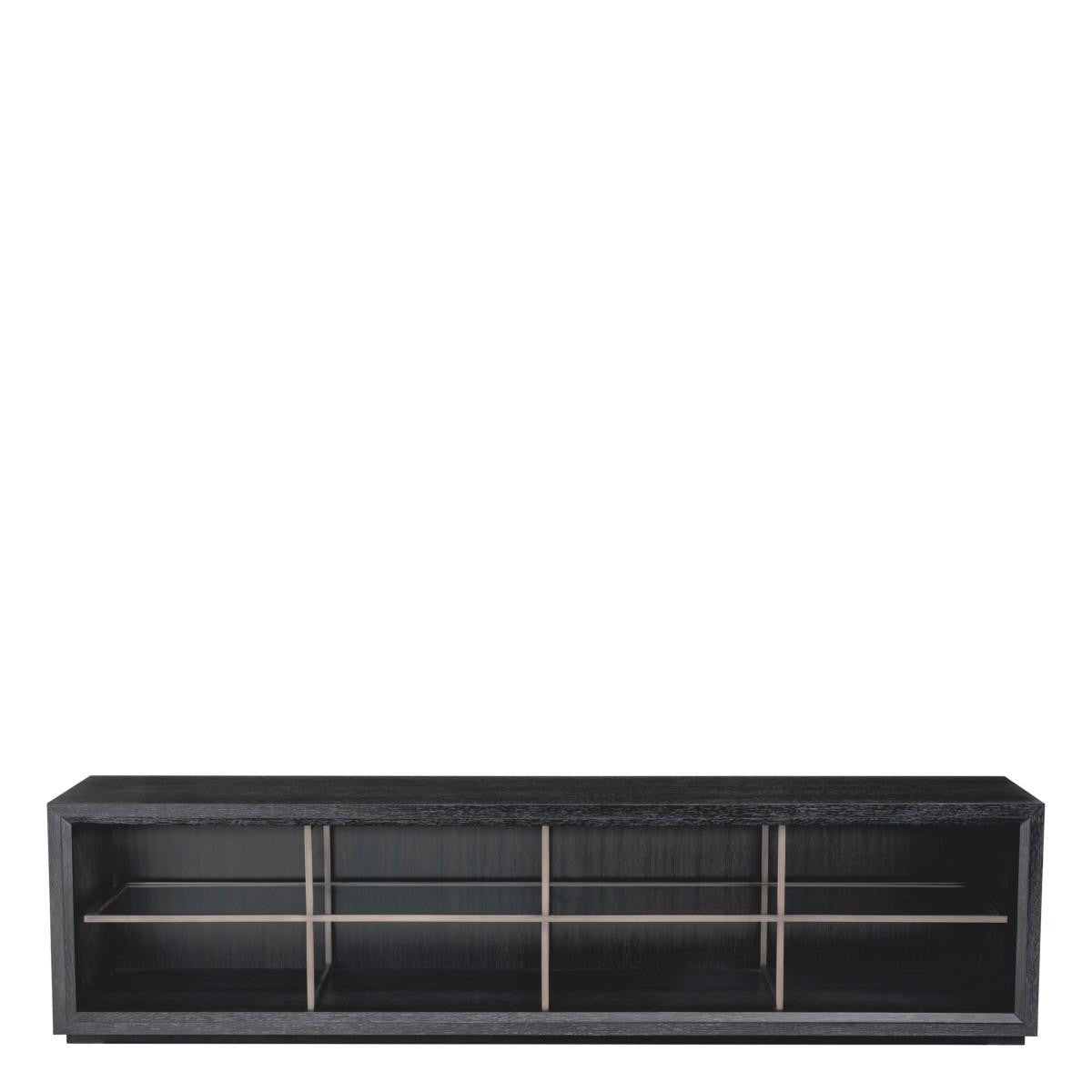 Bring a modern feel to your living room or entertainment space with TV Cabinet Hennessy L. Pairing a clean look with ample storage space, this tv unit provides a beautiful blend of style and functionality. Finished in charcoal oak veneer and containing a medium bronze inner frame with 4 compartments, it features an open build, sleek silhouette, and integrated storage, providing plenty of space for electronics and a media library.