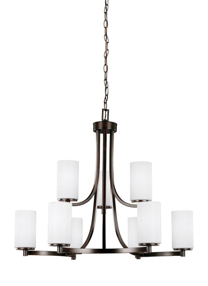 The Sea Gull Lighting Hettinger nine light multi tier chandelier in brushed nickel is an energy star qualified lighting fixture that uses fluorescent bulbs to save you both time and money.The Hettinger lighting collection by Sea Gull Lighting combines a traditional look with chic, modern charm.The minimalism of the tubular glass shades balances with the unique, outward-curve of the semi-circular arm detail.It is available in three finishes - burnt sienna and brushed nickel for the whole collection, and chrome for the bath vanities.The assortment includes six- and nine-light chandeliers; a one-light wall sconce; two-, three- and four-light bath vanity fixtures; a three-light pendant and two- light semi-flush convertible pendant.Incandescent and energy star-qualified LED lamping are available; all fixtures are California title 24 compliant.