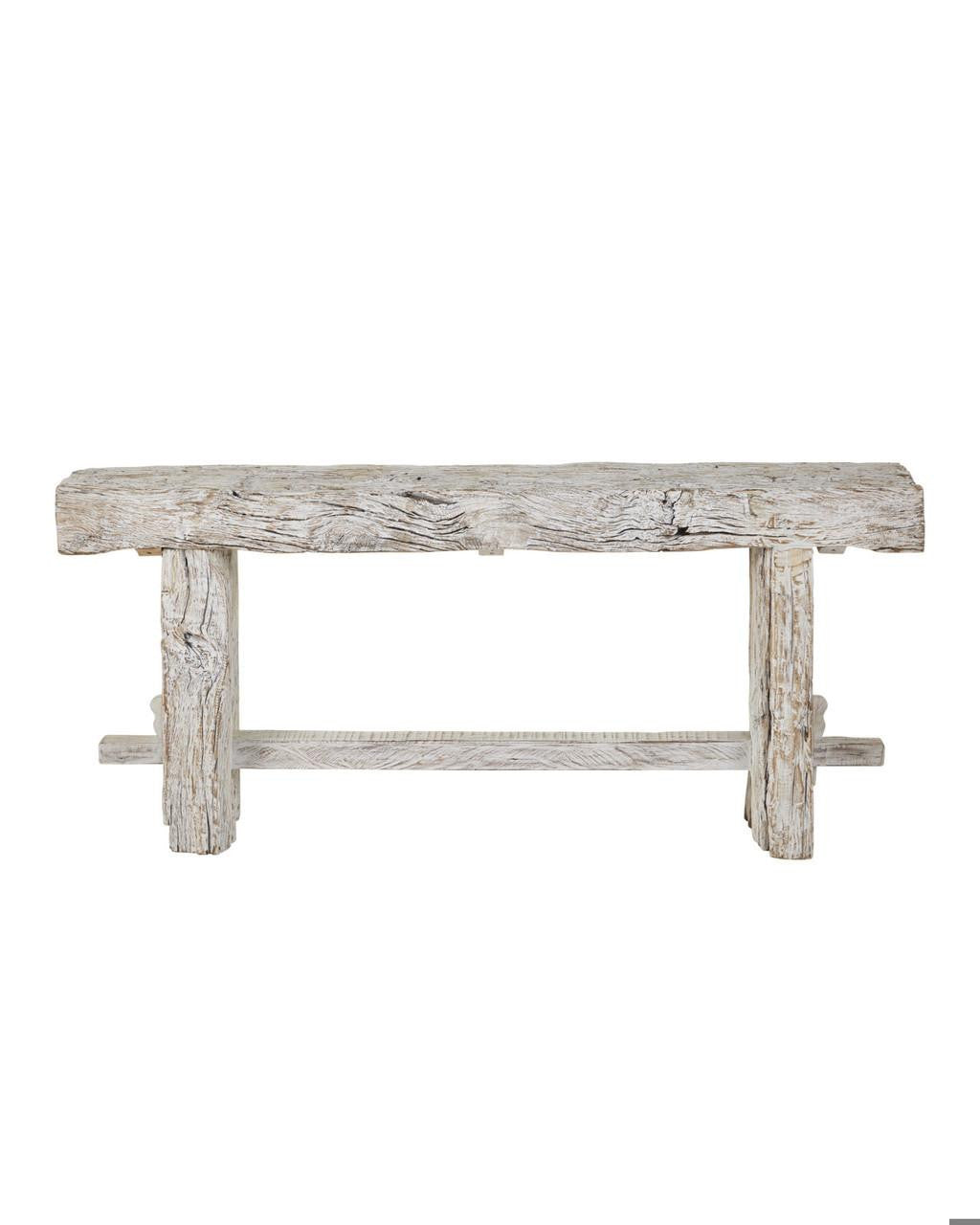 The Holland Console Table is a sustainable piece given it is made from reclaimed wood that is remarkably aged, which brings its surfaces tremendous personality, as does the trestle design with its mortise and tenon joinery. Because the whitewashed table is made from such raw wood, no two will be exactly alike. This piece is meant to be placed indoors only.