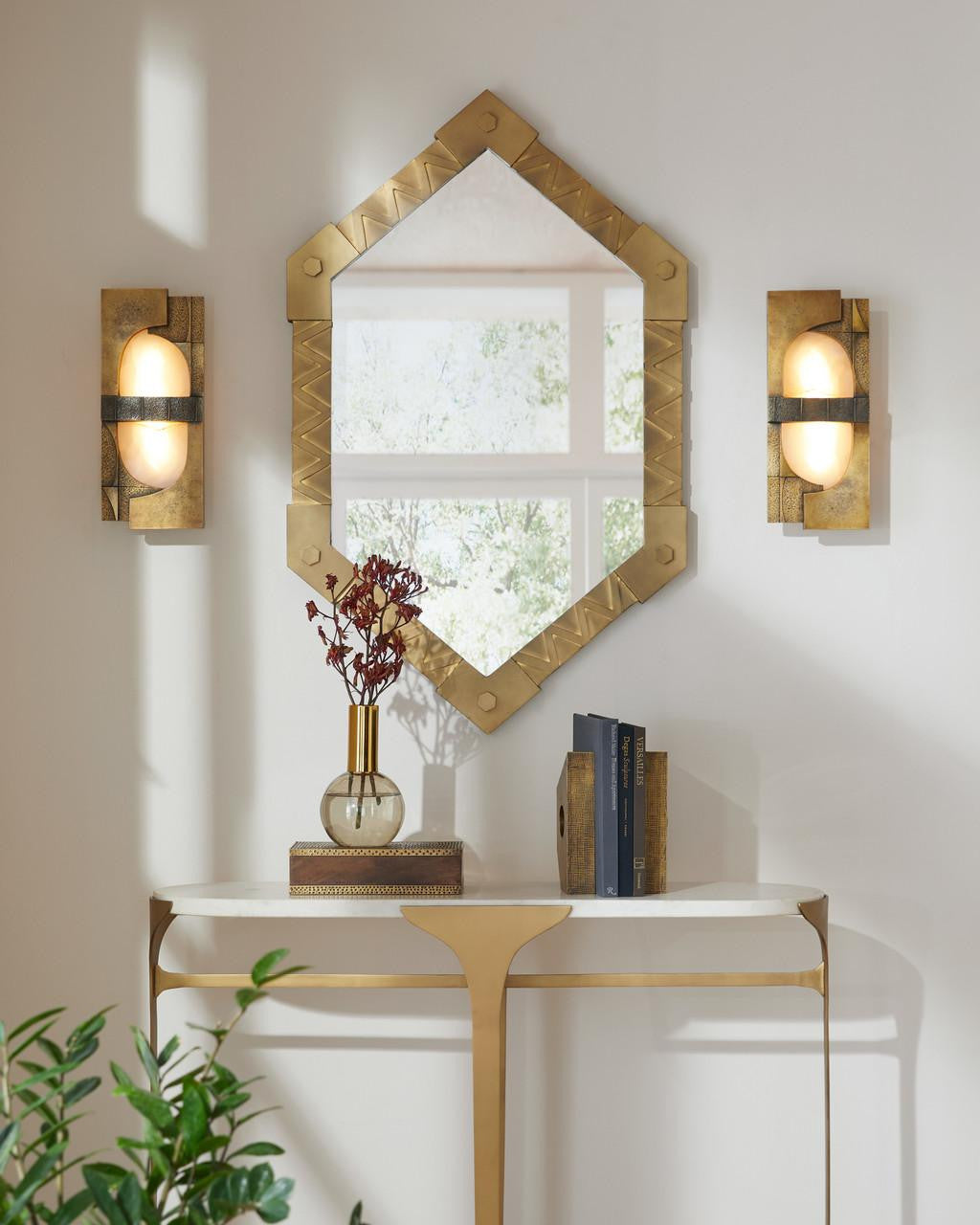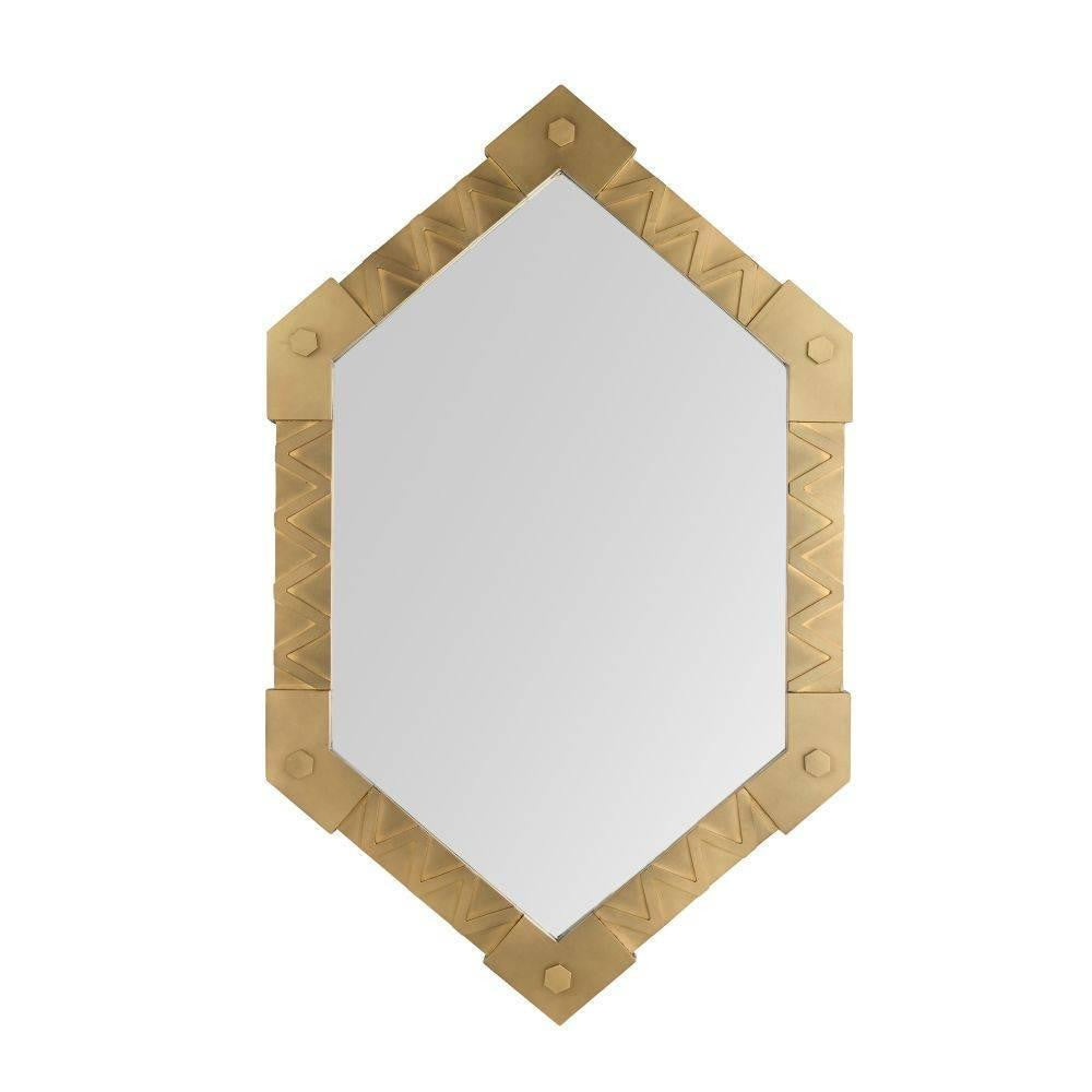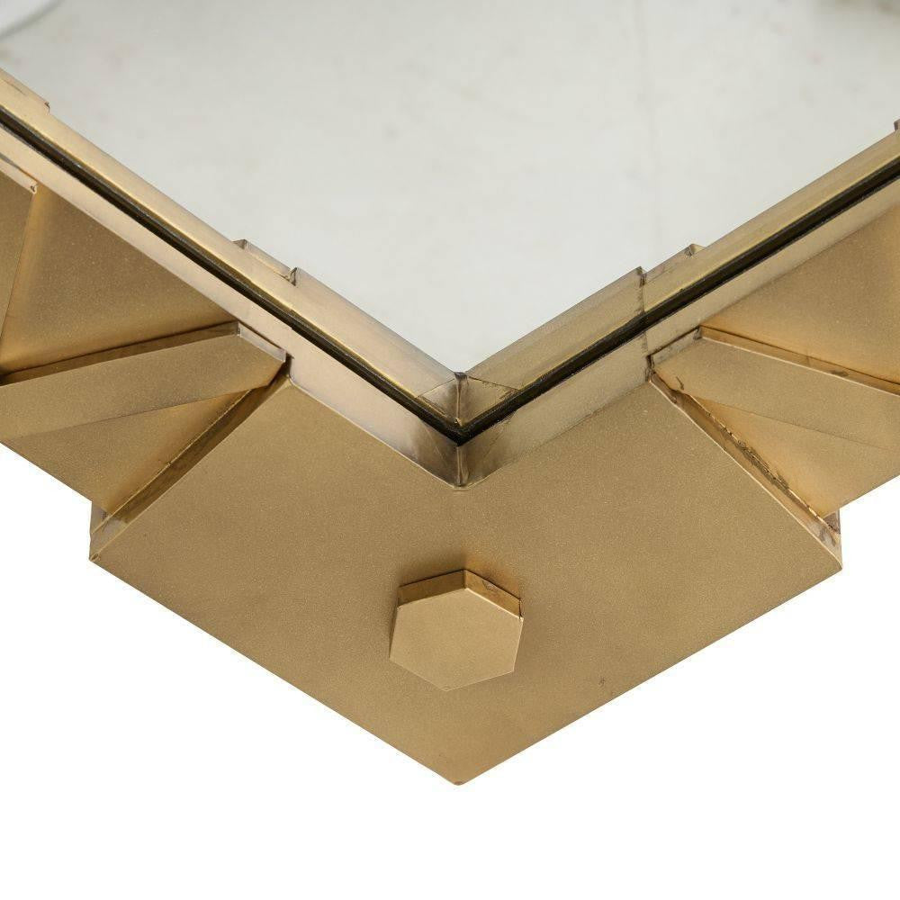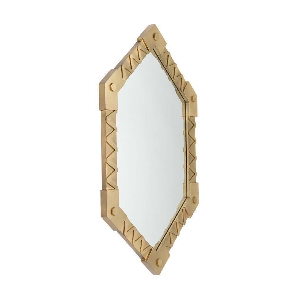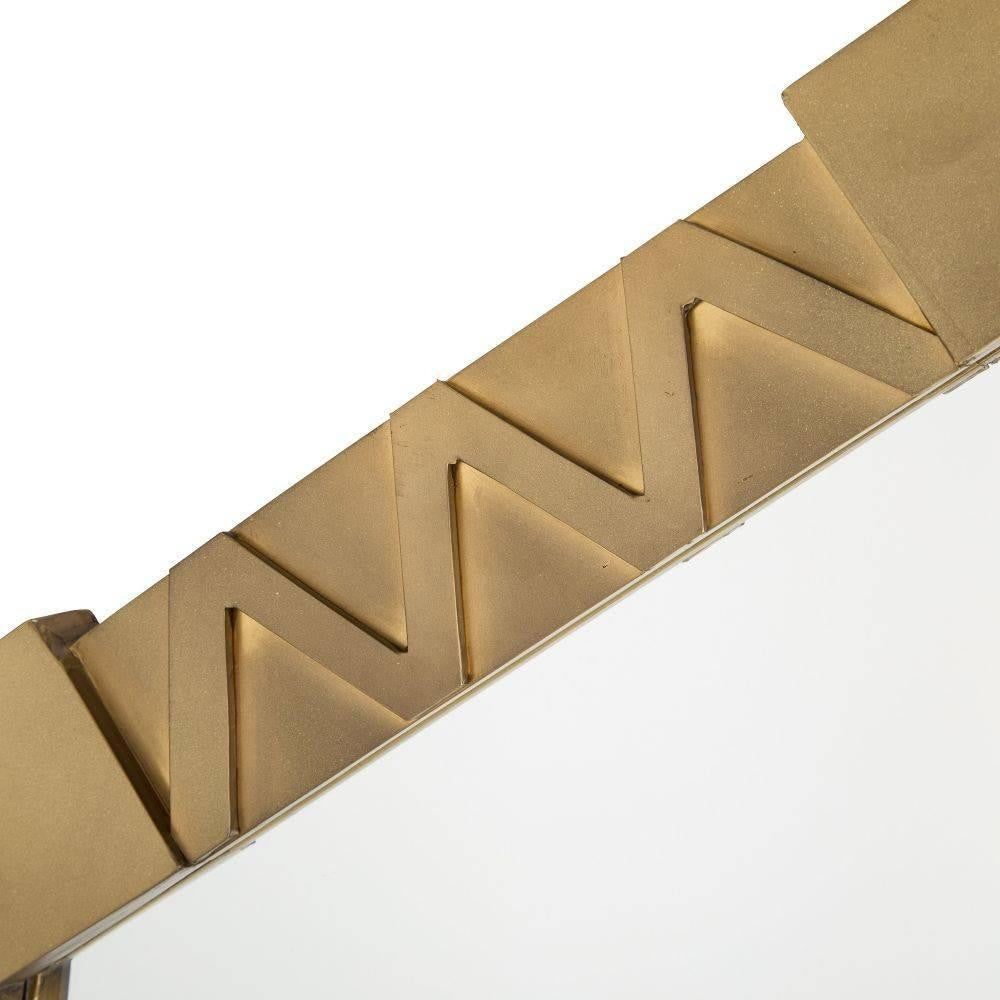 The useful and beautiful aesthetics of the Arts and Crafts movement inform our Holt mirror. Crafted of antique brass-plated iron, the layered metalwork of this handcrafted style adds interest to its geometric form. Designed to be displayed both vertically and horizontally. Secured at the back with a cleat attachment.